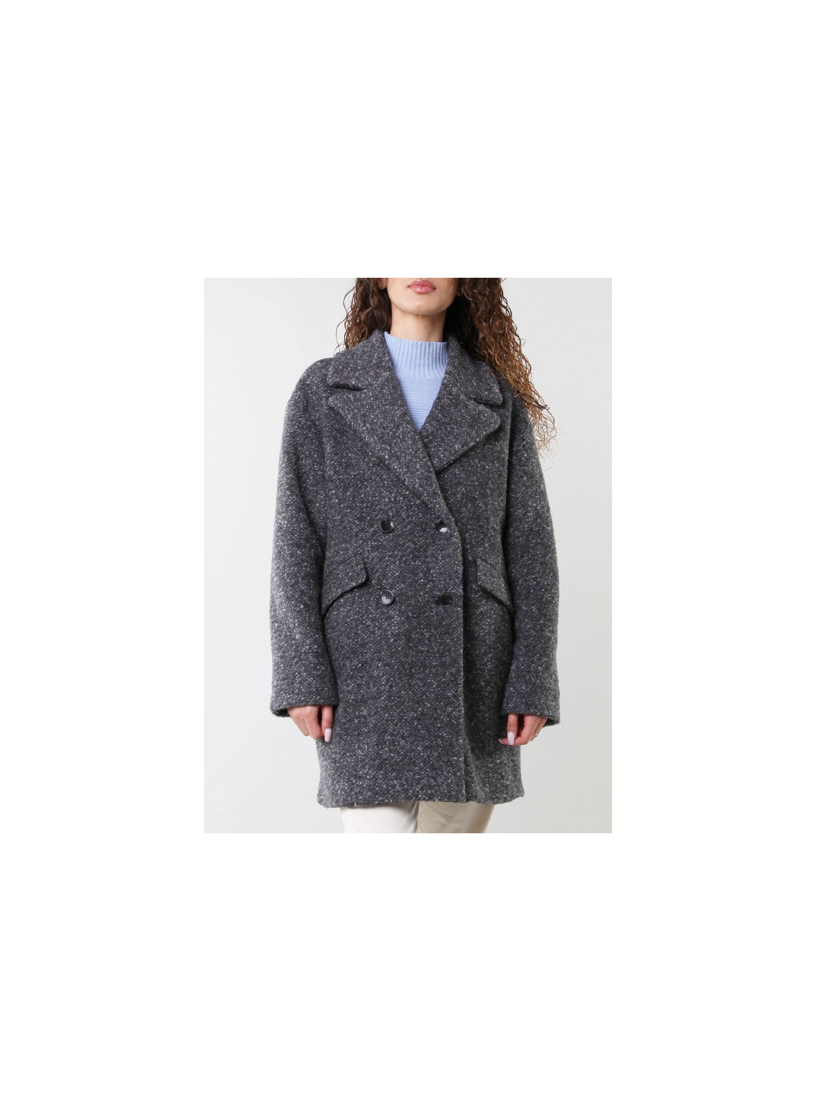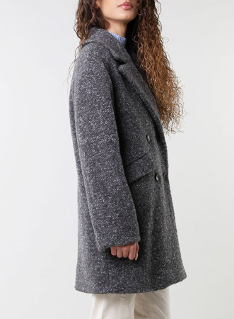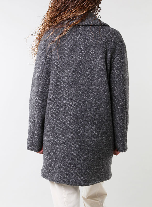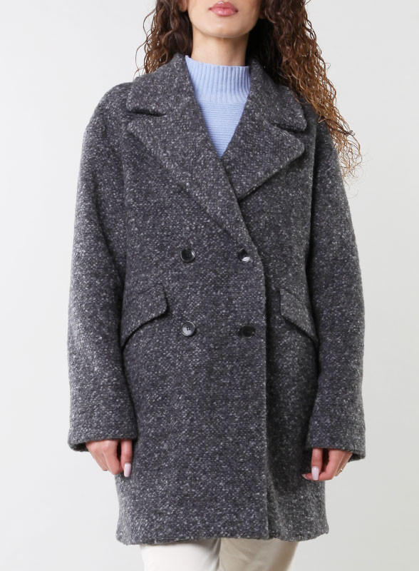 Elegante cappotto doppiopetto in jersey tweed di lana, firmato IBlues. Linea egg shape, tasche a patta, stile contemporaneo.