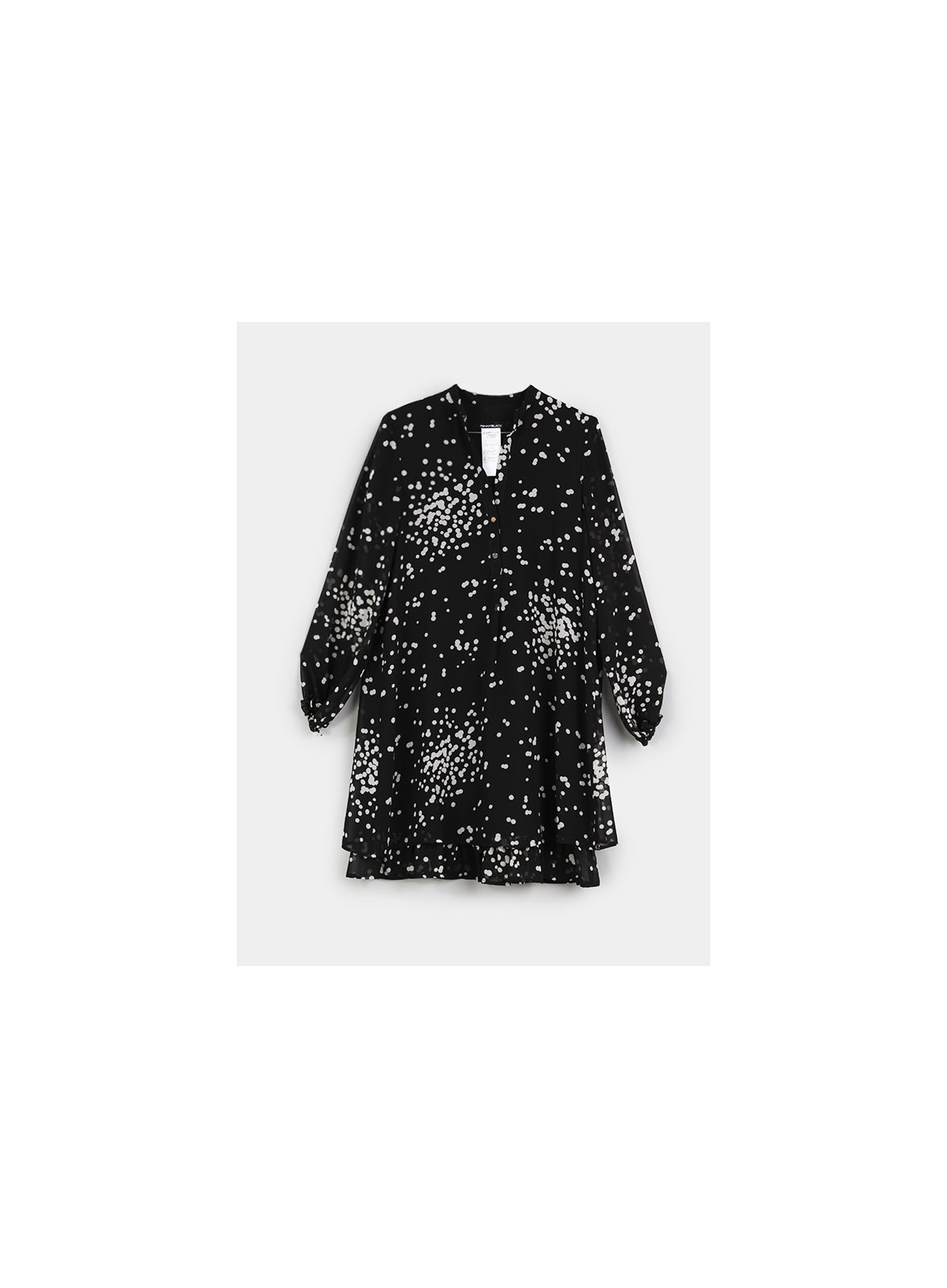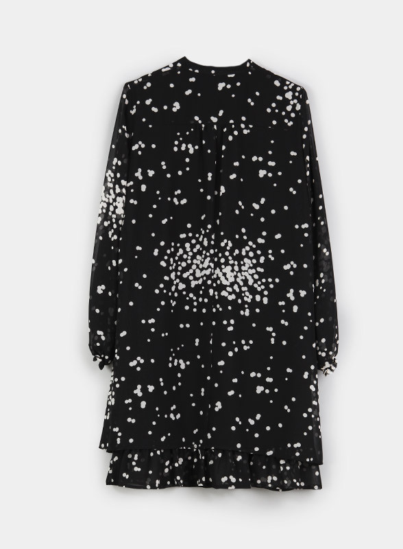 Una pioggia di frizzantissimi pois sull’abito day-to-night in georgette. Linee svasate, collo alla coreana con bottoncini sul davanti, taglio carré sulla schiena. Balza arricciata al fondo, polsi elastici con piccole ruches. Parzialmente foderato. Pennyblack è espressione di una moda dinamica pensata per soddisfare le esigenze della donna moderna.