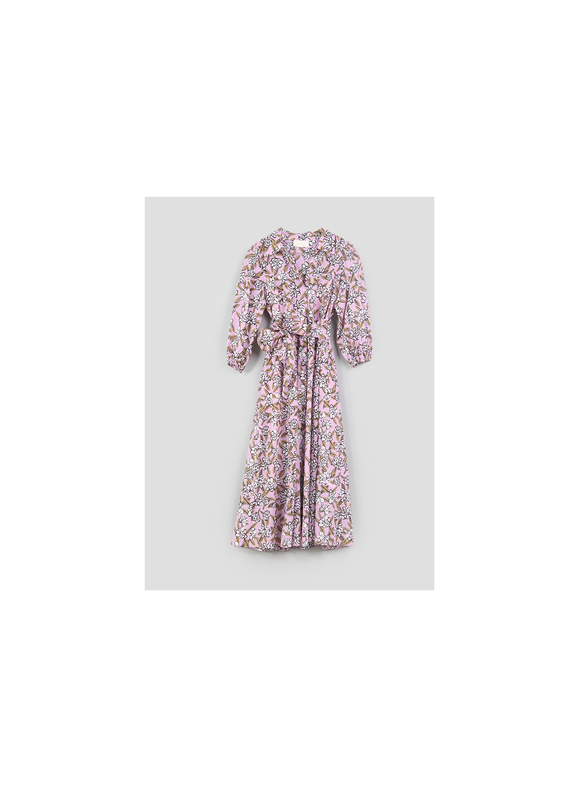 Abito chemisier lungo firmato Iblues in mussola di cotone stampato, linea scivolata, cintura abbinata della collezione SS24.