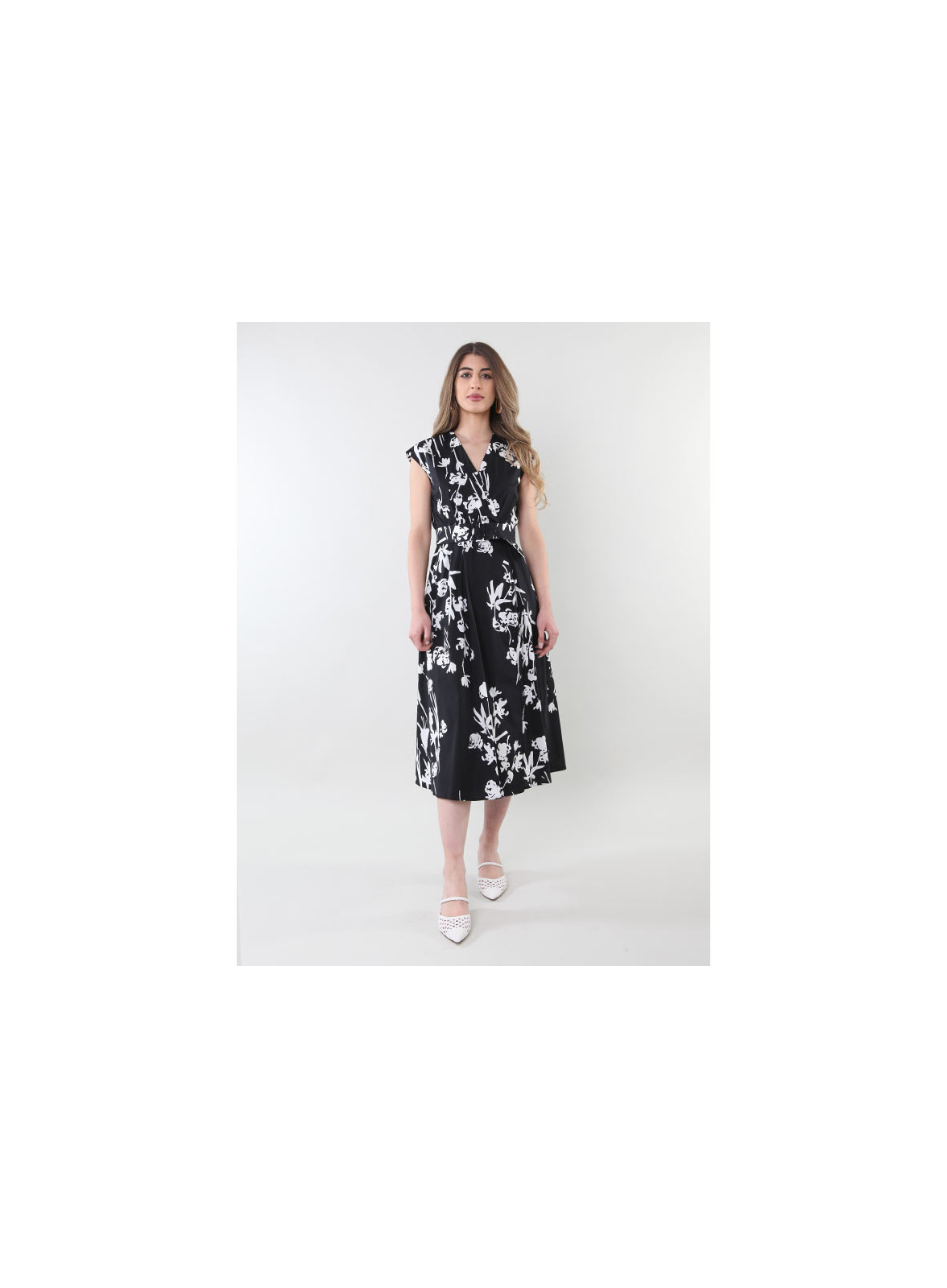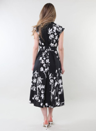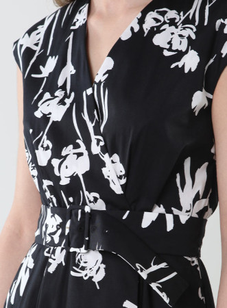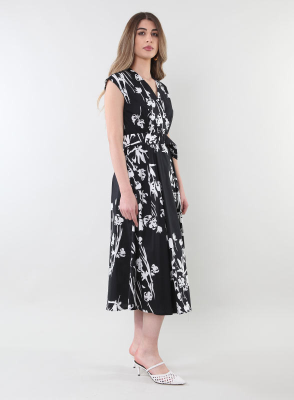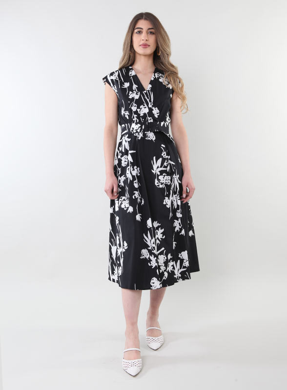 Abito floreale firmato Marella in popeline, linea midi, cintura, scollatura a V incrociata.