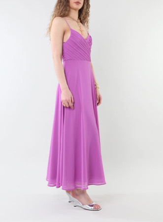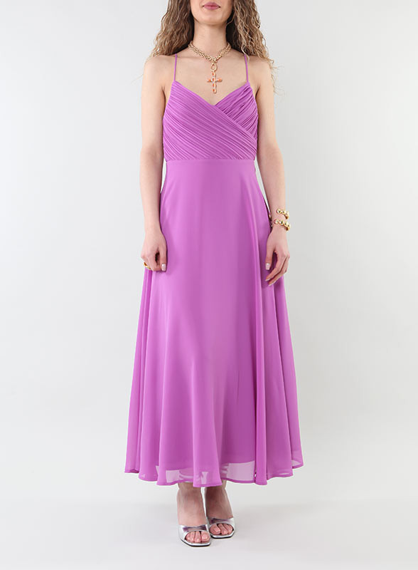 Elegante abito lungo firmato Marella: scollo plissettato incrociato, zip invisibile sul retro della collezione SS24.