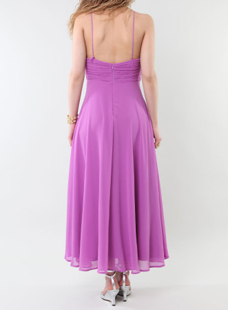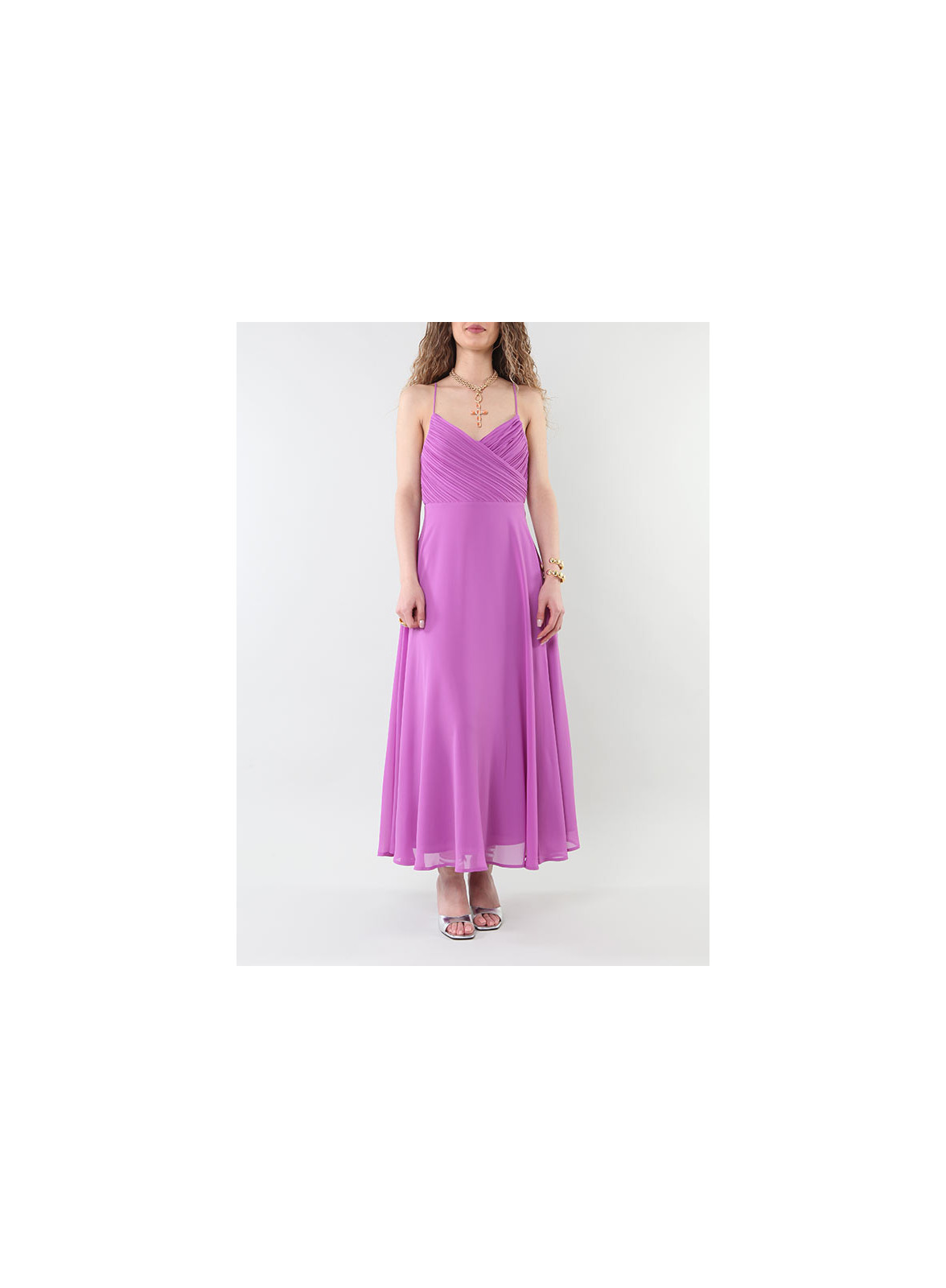 Lo scollo plissettato incrociato aggiunge un tocco raffinato, mentre gli spallini sottili incrociati donano un dettaglio chic. Sul retro, una zip invisibile garantisce una chiusura discreta.