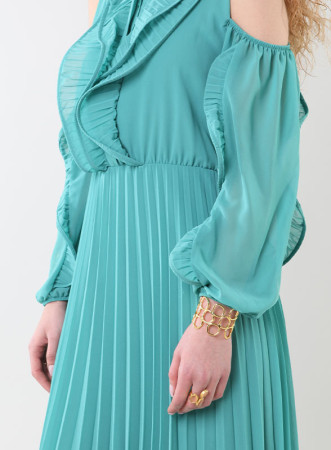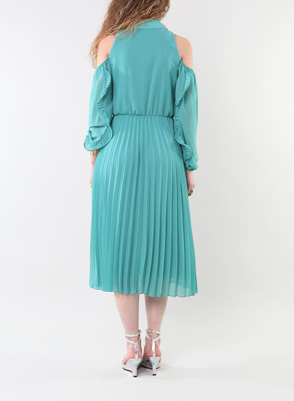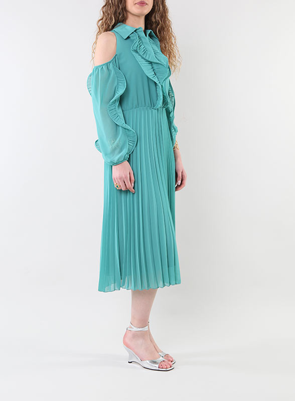 Il corpetto definito si distingue per la sua raffinatezza, con bottoncini in tinta e un jabot che aggiunge un tocco di classe. Le maniche volant incorniciano delicatamente il look, conferendo un'aria sofisticata. La gonna plissé chiusa dona al capo un'eleganza raffinata e unica. Con una vestibilità regolare, questo abito è l'ideale per serate speciali o occasioni formali, perfetto per la donna moderna e sicura di sé.