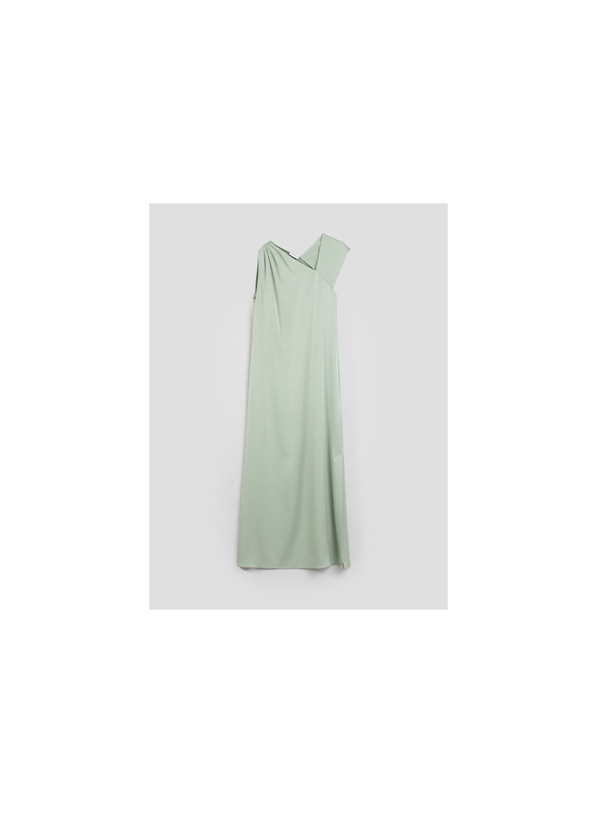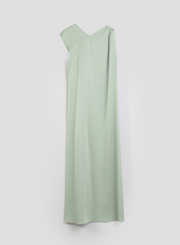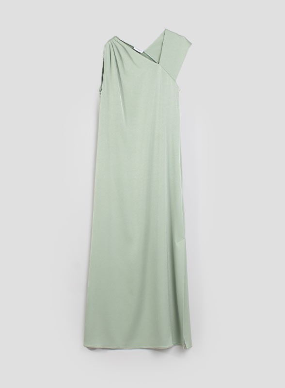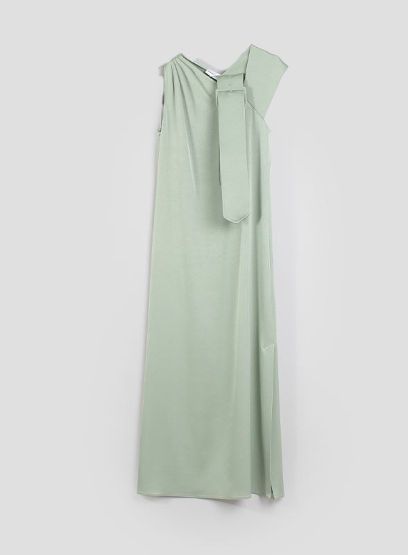 Abito sfoderato firmato MARELLA, in satin tecnico dal fit dritto, con scollo asimmetrico e cintura alta per enfatizzare il punto vita.