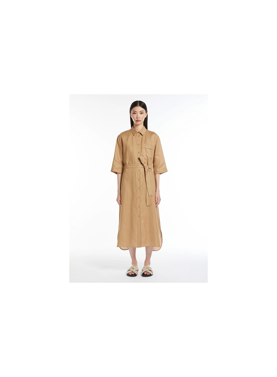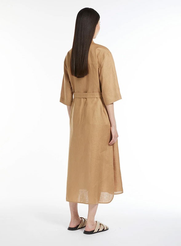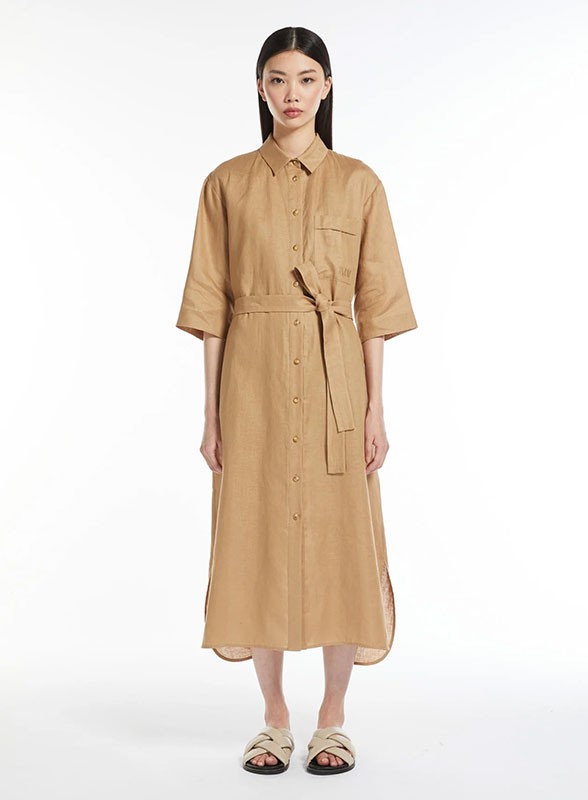 Abito chemisier midi firmato MAX MARA in puro lino con cintura in tinta, colletto classico e tasca con monogram. Eleganza firmata MAX MARA.