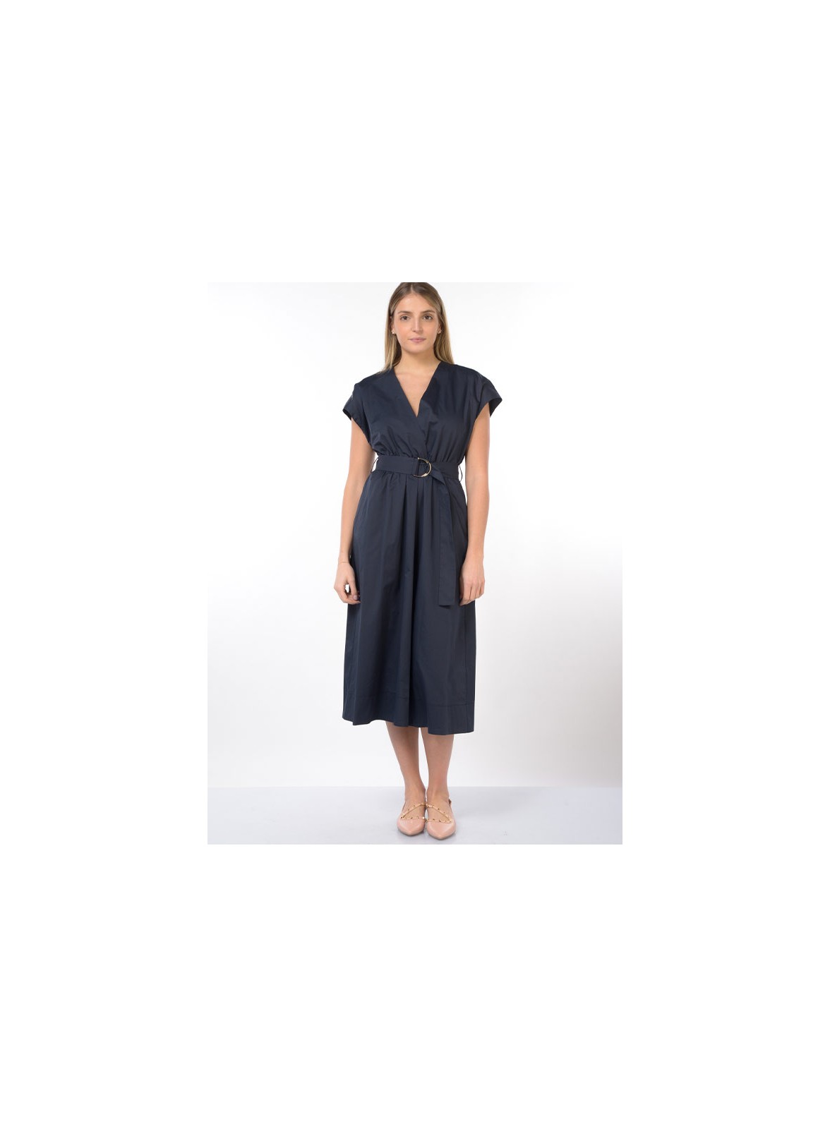 Abito midi firmato KAOS, pensato per una donna che ama vestire con eleganza anche nelle occasioni più informali. Il modello è realizzato in 100% cotone, materiale naturale e traspirante, ideale per la stagione più calda. Presenta una scollatura a V incrociata che valorizza il décolleté, completata da maniche corte ad aletta che donano un tocco femminile e delicato alla silhouette. La vita è definita da una cintura rimovibile nello stesso tessuto, che permette di regolare la vestibilità secondo le proprie preferenze, mentre le tasche laterali aggiungono praticità senza rinunciare allo stile. La linea dell’abito è regolare e cade morbida, rendendolo comodo e versatile per il quotidiano o per un’uscita informale.