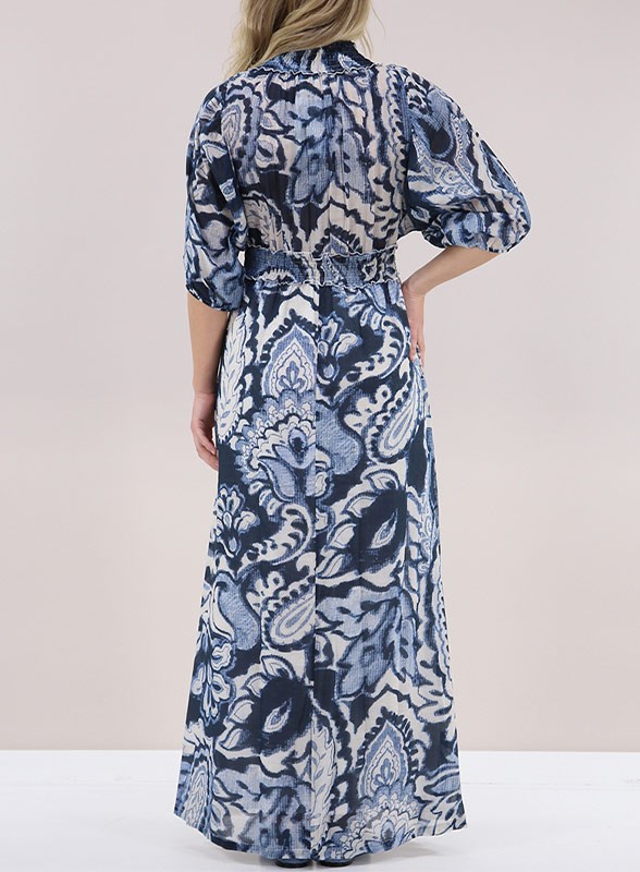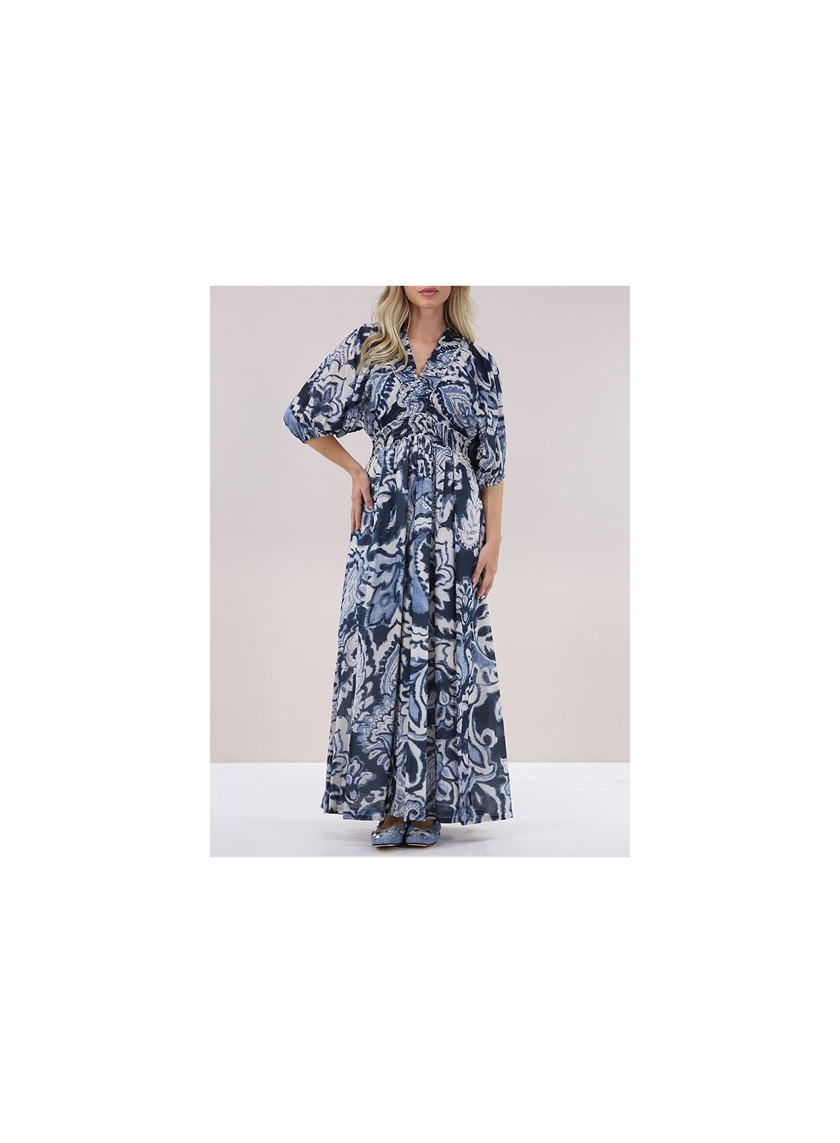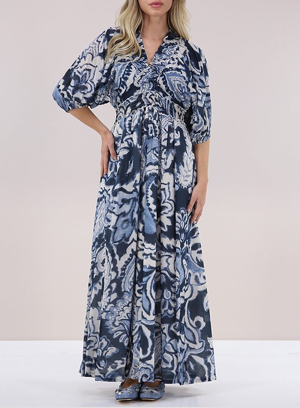 Abito lungo firmato KAOS con scollo a V, manica a sbuffo e gonna svasata. Eleganza leggera firmata per ogni occasione.