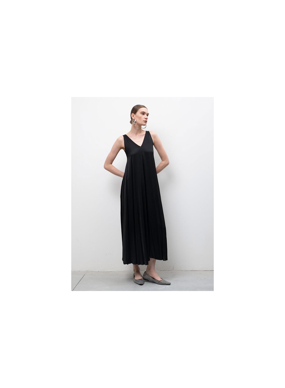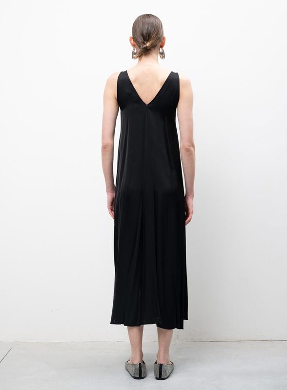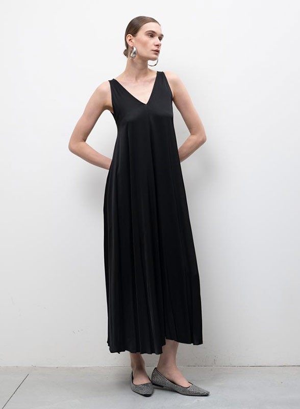 Abito lungo firmato KAOS, realizzato in viscosa effetto raso che dona al capo un'eleganza luminosa e delicata. Il modello è caratterizzato da un profondo scollo a V sia sul davanti che sul retro, elemento che conferisce femminilità e modernità alla silhouette. La linea svasata accompagna il corpo con leggerezza, garantendo una vestibilità regolare e adatta a diverse fisicità.