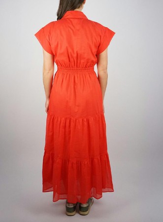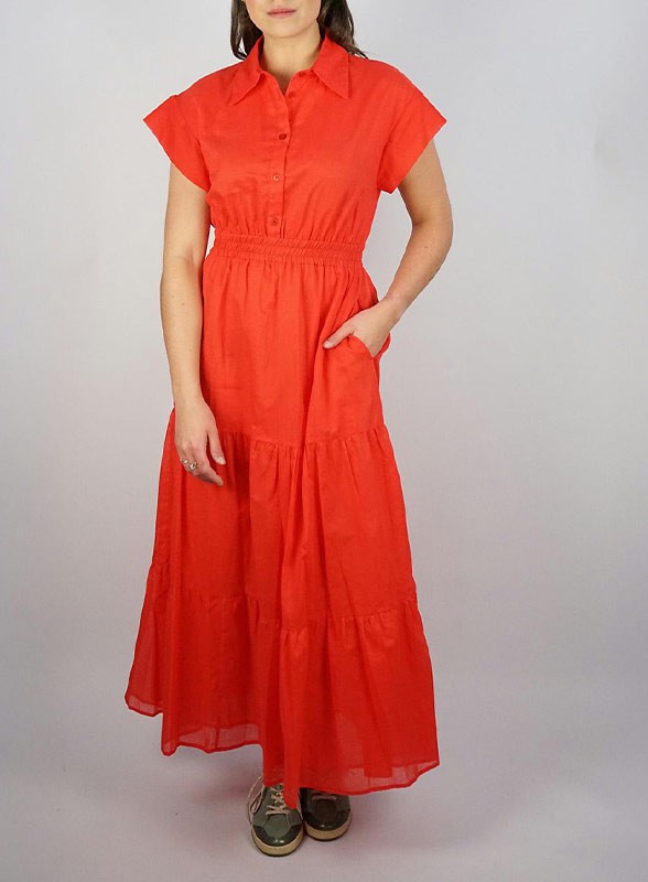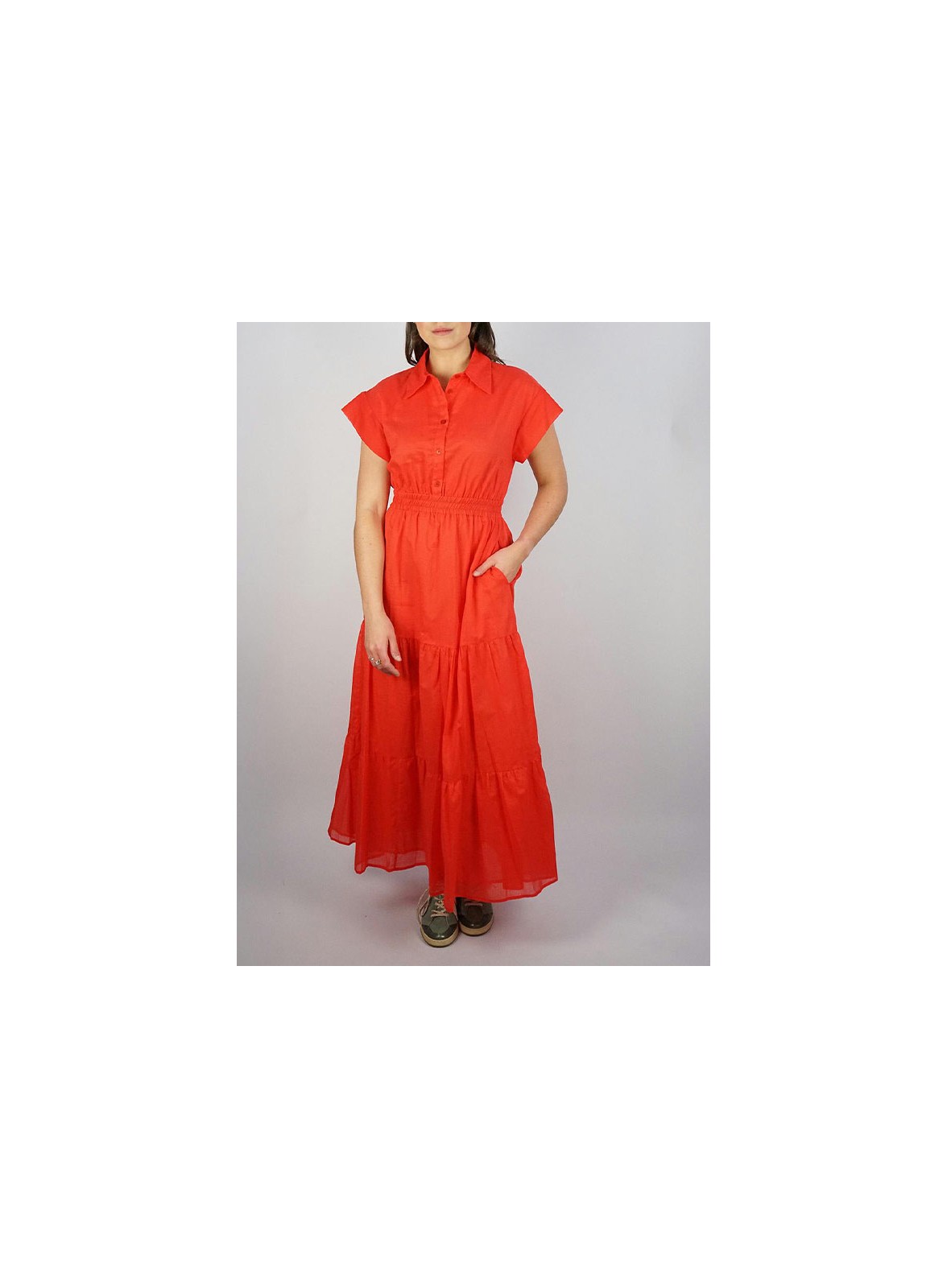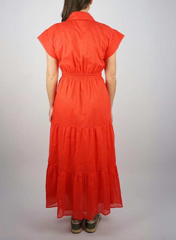 Abito lungo firmato KAOS, pensato per offrire comfort e stile durante le giornate più calde. Realizzato in fresco cotone, presenta un corpino con bottoncini in tinta, collo a camicia e maniche corte scese che donano un tocco casual ma raffinato. La gonna è fluida e arricchita da una balza al fondo che aggiunge movimento alla silhouette, completata da pratiche tasche nascoste. L’abito è foderato per garantire una vestibilità impeccabile e una maggiore copertura.