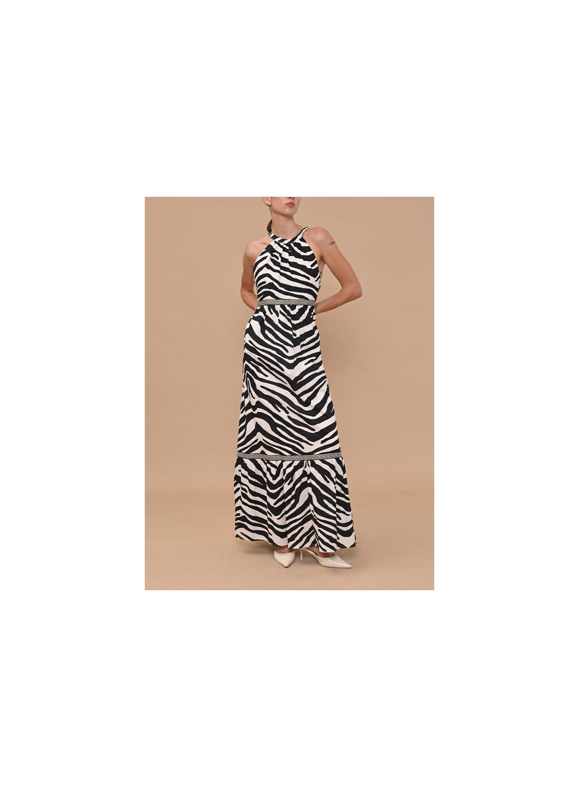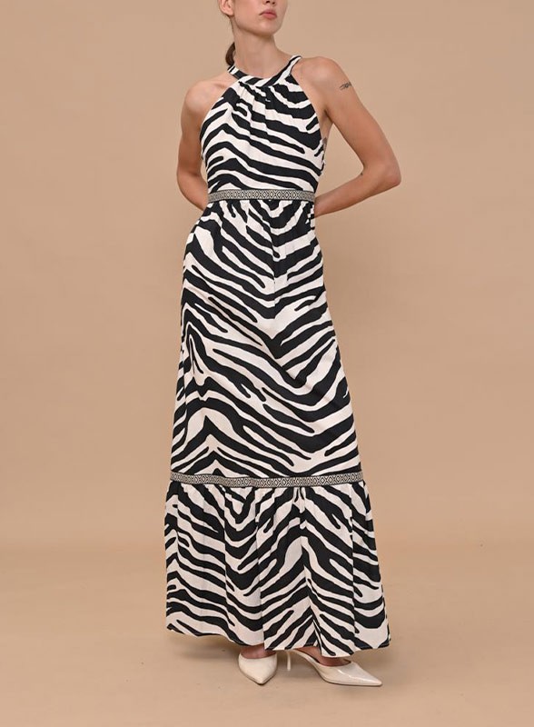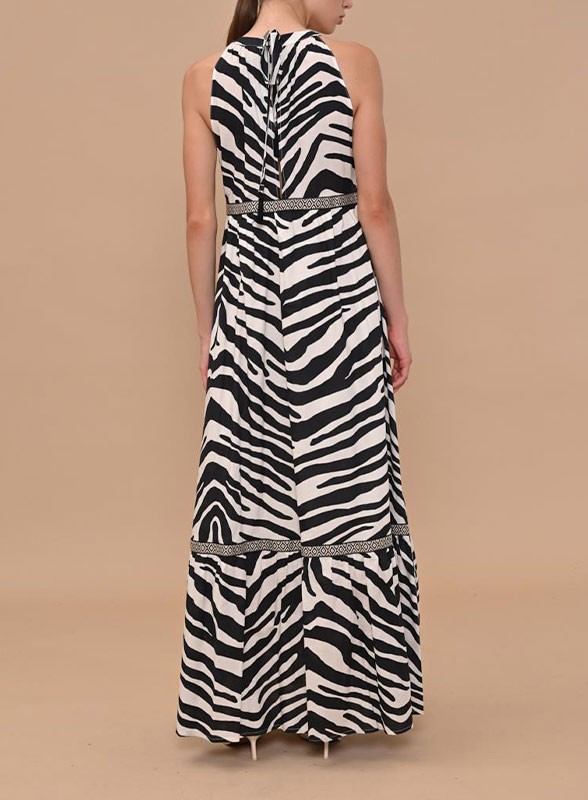 Abito firmato KAOS, dal design sofisticato e dalla linea femminile. Realizzato in puro cotone, questo capo si distingue per la stampa animalier, raffinata e di tendenza. Il modello presenta uno scollo all’americana chiuso da un laccetto al collo, che dona eleganza e struttura alla parte superiore. La gonna, morbida e fluida, è arricchita da un motivo a contrasto che evidenzia delicatamente il punto vita, creando una silhouette armoniosa. Sul retro, lo scollo a V aggiunge un tocco sensuale e moderno. L’abito è completamente foderato per garantire comfort e vestibilità.