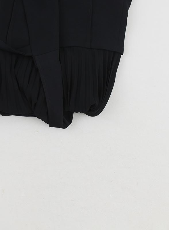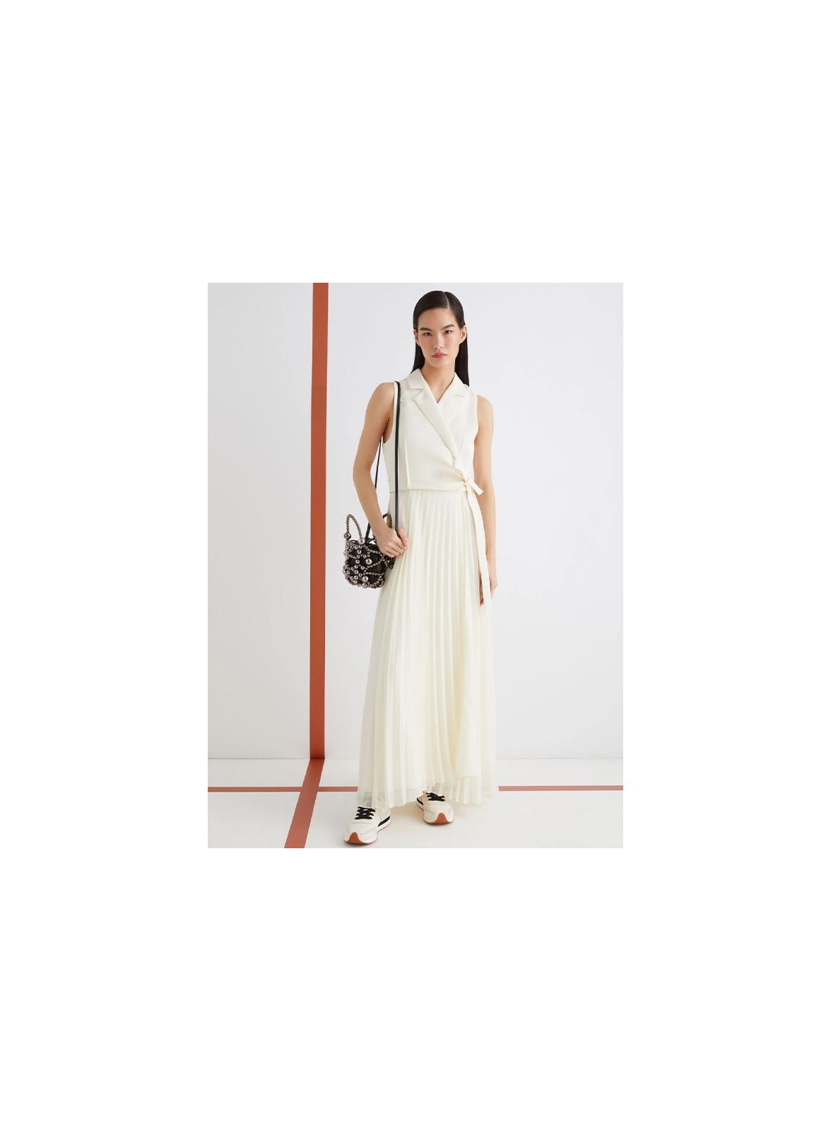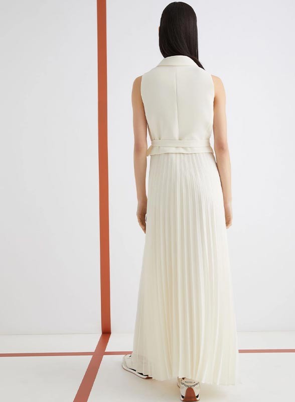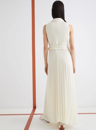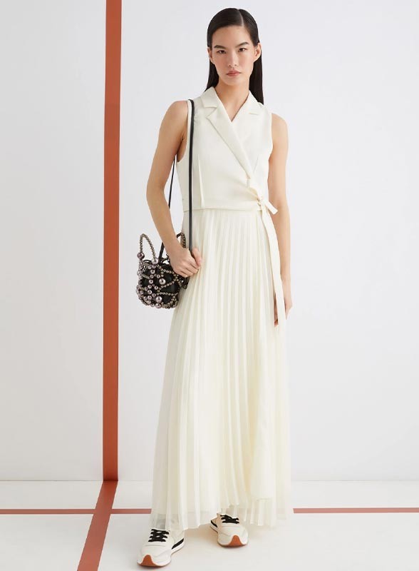 Abito firmato MARELLA, realizzato in un raffinato mix di crêpe envers satin e georgette foderato in crêpe de Chine. Il modello presenta una linea elegante e fluida: la parte superiore è formata da un top dritto e smanicato con scollo a rever, mentre la gonna in georgette plissettata dona movimento e leggerezza all’intera figura. La chiusura laterale è arricchita da una fusciacca che consente di regolare la vestibilità valorizzando il punto vita. Il fondo asimmetrico aggiunge un tocco contemporaneo e sofisticato, rendendo l’abito perfetto sia per occasioni formali che per eventi speciali.