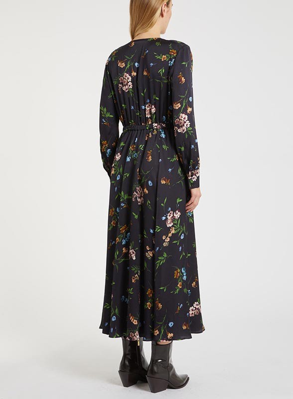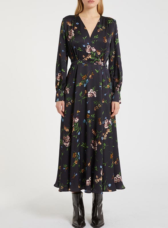 Abito firmato MARELLA in raffinato raso di viscosa stampato, dal fit regolare e dalla linea scivolata che valorizza la figura con eleganza e comfort. Lo scollo a V incrociato e l’arriccio su una spalla, in vita e ai polsi, donano un tocco di femminilità sofisticata. La gonna svasata e foderata conferisce movimento e leggerezza al fondo, creando una silhouette slanciata e armoniosa. L’inserto elastico sul retro della vita assicura una vestibilità comoda e versatile, adatta a diverse occasioni, dal giorno alla sera.