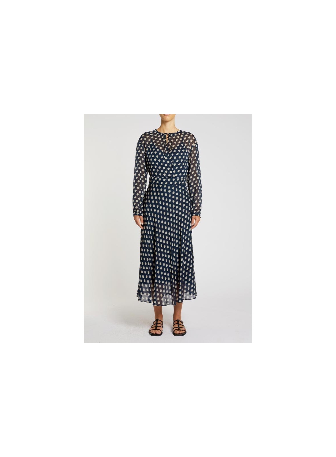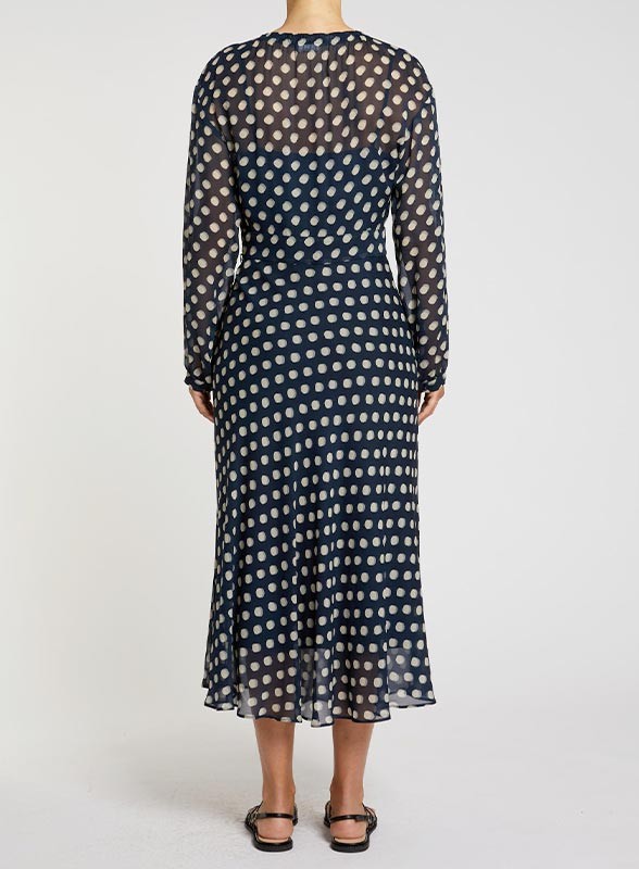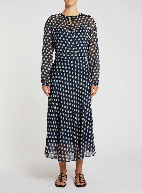 Abito lungo in georgette stampata a pois firmato PENNYBLACK, caratterizzato da una linea fluida e femminile. Il taglio in vita valorizza la silhouette grazie al cintone che definisce il punto vita, mentre la gonna a godè dona movimento e ampiezza al fondo. Le maniche lunghe presentano un leggero arriccio al polso con chiusura a bottone, mentre il girocollo è impreziosito da impunture e arricci con listini da annodare sul davanti per regolare l’apertura. Il capo è completato da una sottoveste interna e ha una lunghezza di 118 cm.