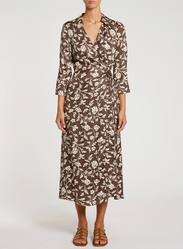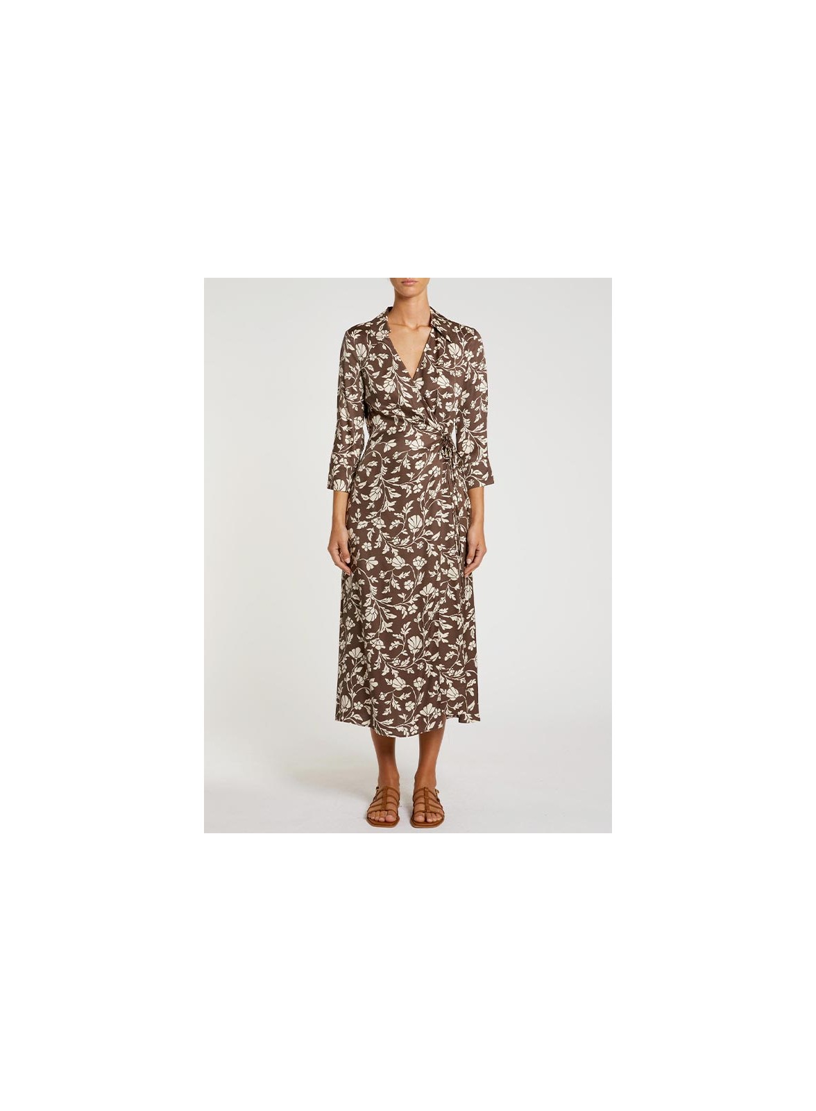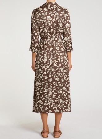 Abito firmato PENNYBLACK realizzato in twill di viscosa, caratterizzato da raffinati ramages grafici che valorizzano linee fluide e femminili. Il design a portafoglio definisce delicatamente la silhouette, mentre i laccetti laterali permettono di regolare la vestibilità enfatizzando il punto vita. Il colletto aperto con scollo a V e le maniche trequarti con polsini abbottonati donano un tocco sofisticato, rendendolo ideale per diverse occasioni, dal quotidiano agli eventi più eleganti. Il capo, sfoderato e con fit regolare, presenta una linea leggermente svasata al fondo per un movimento naturale e armonioso.
