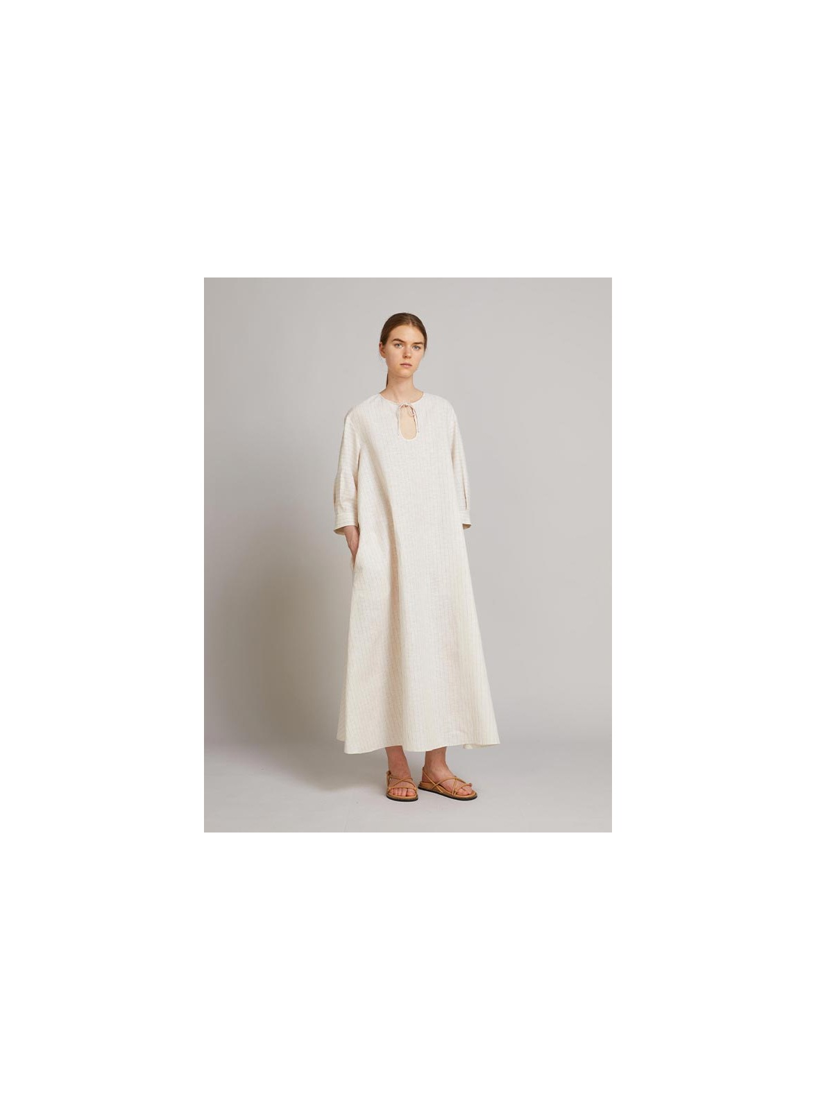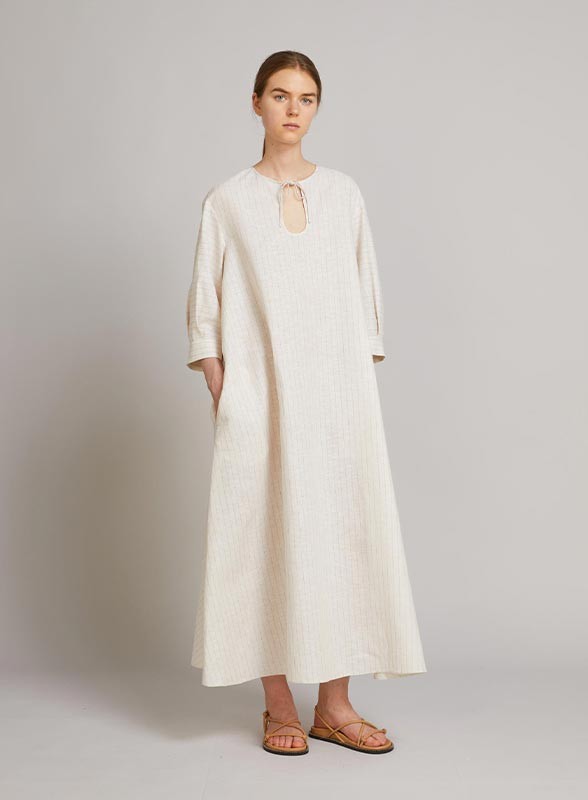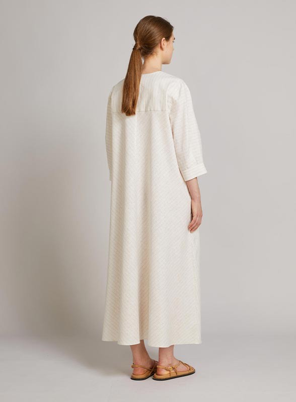 Abito maxi caftano firmato MM MAXMARA, caratterizzato da una silhouette A-line oversize che valorizza la figura con eleganza e comfort. Realizzato in una raffinata tela di lino e cotone, presenta una linea ampia e svasata al fondo che dona movimento e leggerezza al capo. La scollatura a goccia con chiusura a laccetti in tessuto aggiunge un dettaglio femminile e delicato. Le maniche al gomito con spalla scesa, pieghe montate e polsino alto completano il design, insieme al taglio sprone sul retro con apertura centrale su tutta la lunghezza. Il capo è inoltre foderato per garantire una vestibilità impeccabile.