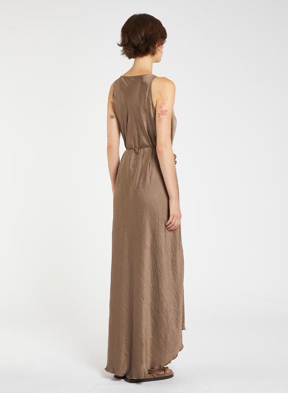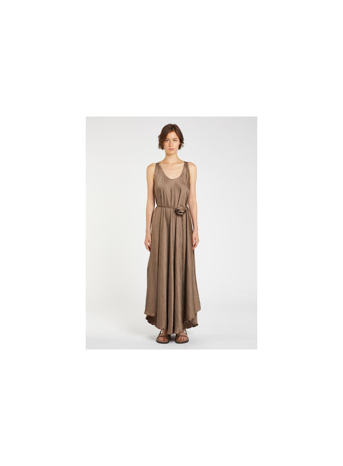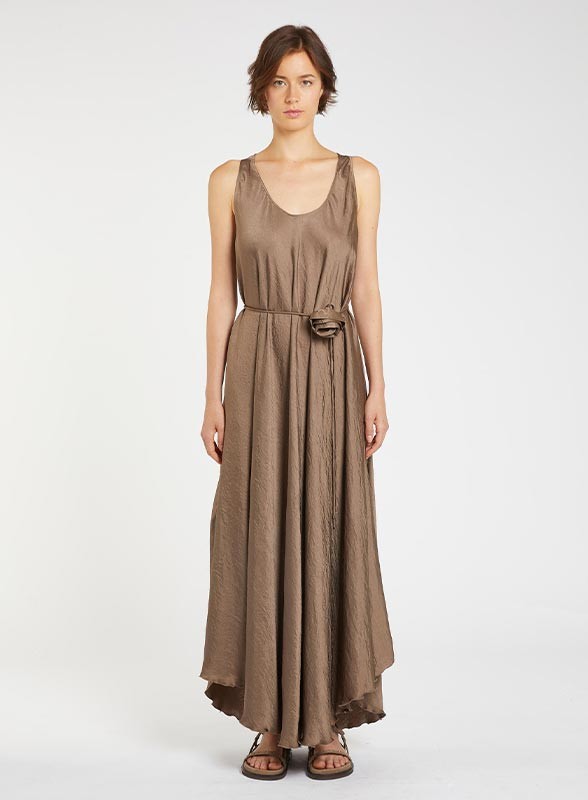 Abito firmato PENNYBLACK in tela di lino e viscosa, con linea slim al busto e fondo svasato. Eleganza senza tempo per ogni occasione.