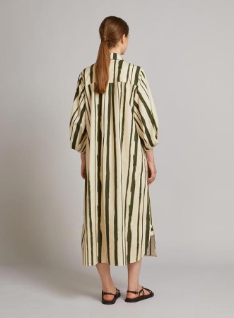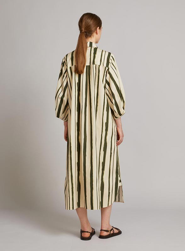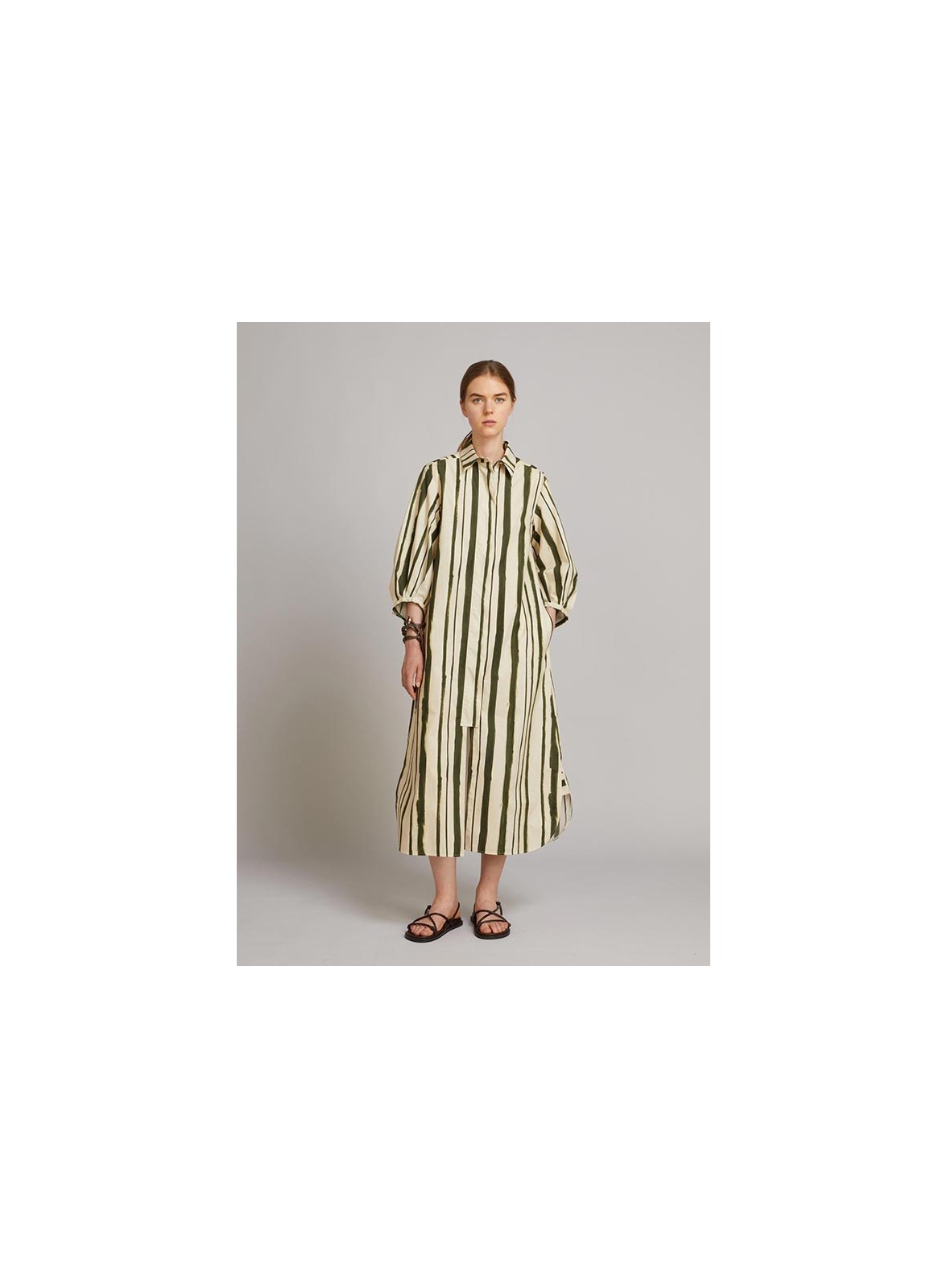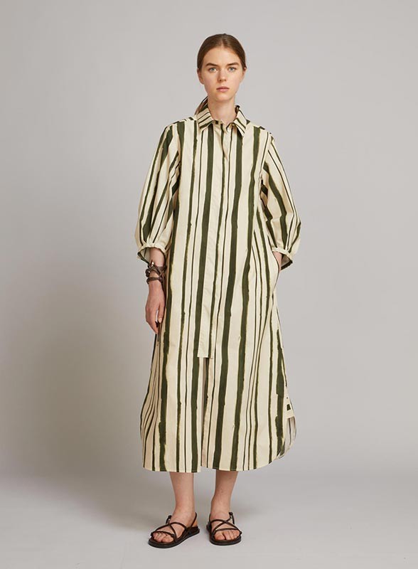 Abito chemisier lungo firmato MM MaxMara, realizzato in leggero popeline di cotone e caratterizzato da una raffinata silhouette A-line che valorizza la figura con naturale eleganza. Il modello presenta una vestibilità leggermente ampia e confortevole, ideale per accompagnare i movimenti con fluidità. Il colletto a camicia è impreziosito da un primo bottone gioiello, mentre le maniche 3/4 ballon con motivo di pieghe e fondo asimmetrico aggiungono un tocco distintivo e contemporaneo. La chiusura frontale con bottoni nascosti mantiene la linea pulita, mentre le tasche inserite nei fianchi garantiscono praticità. Il capo è sfoderato per una maggiore leggerezza.