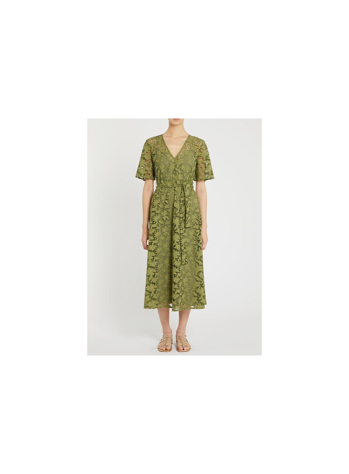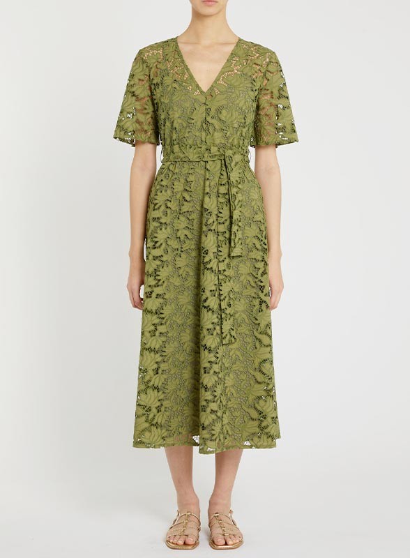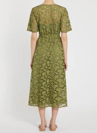 Abito midi firmato PENNYBLACK realizzato in fresco cotone sangallo, arricchito da delicati ricami floreali dalle trame leggere che donano movimento e raffinatezza alla silhouette. Il design bon chic è valorizzato dallo scollo a V e dalle maniche corte leggermente svasate, mentre la cintura coordinata da annodare in vita sottolinea la figura con eleganza. La chiusura con zip invisibile sul fianco garantisce praticità senza rinunciare allo stile. Il capo è completato da una sottoveste interna per assicurare comfort e vestibilità impeccabile. Il fit è aderente nella parte superiore e si apre con una linea svasata sul fondo, perfetto per affrontare con classe anche le giornate più calde.