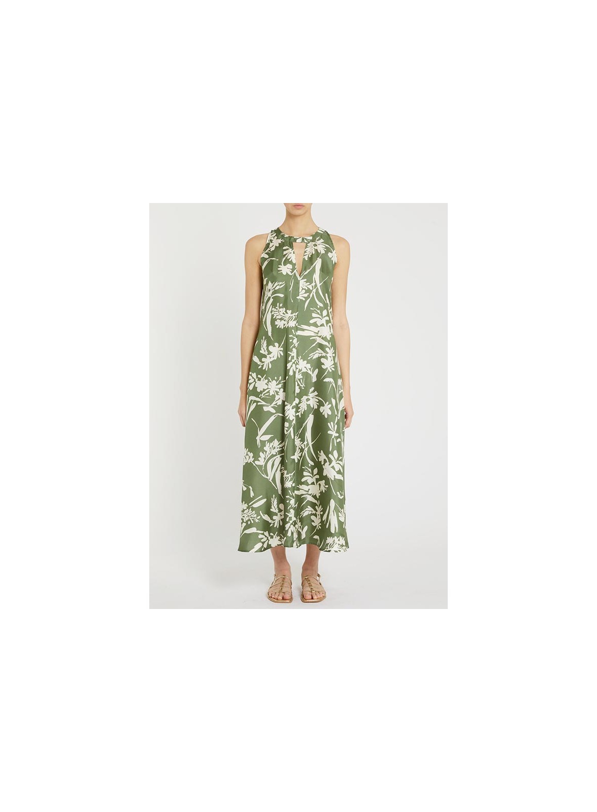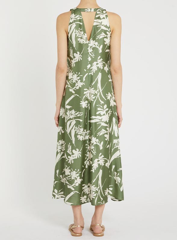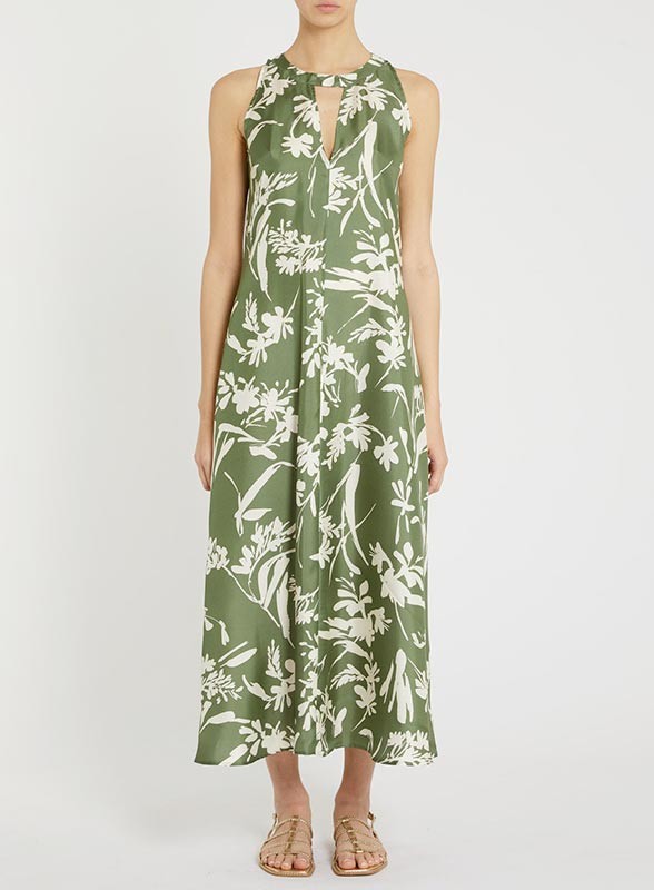 Abito midi firmato PENNYBLACK in twill di seta con fantasia floreale verde, taglio svasato e design elegante per eventi estivi.