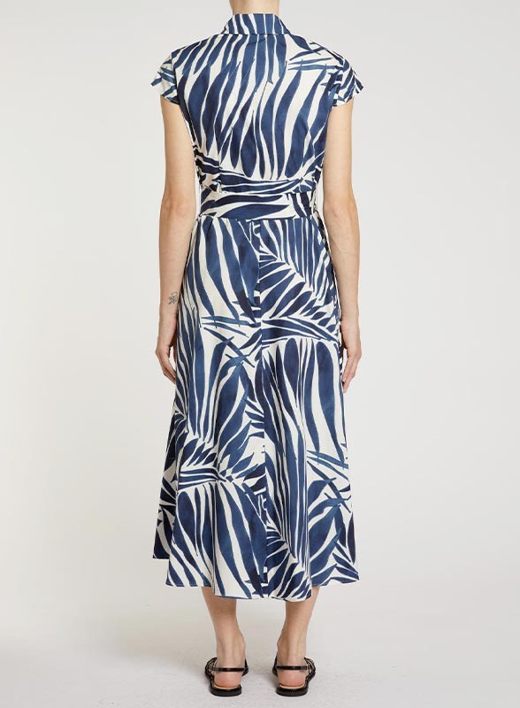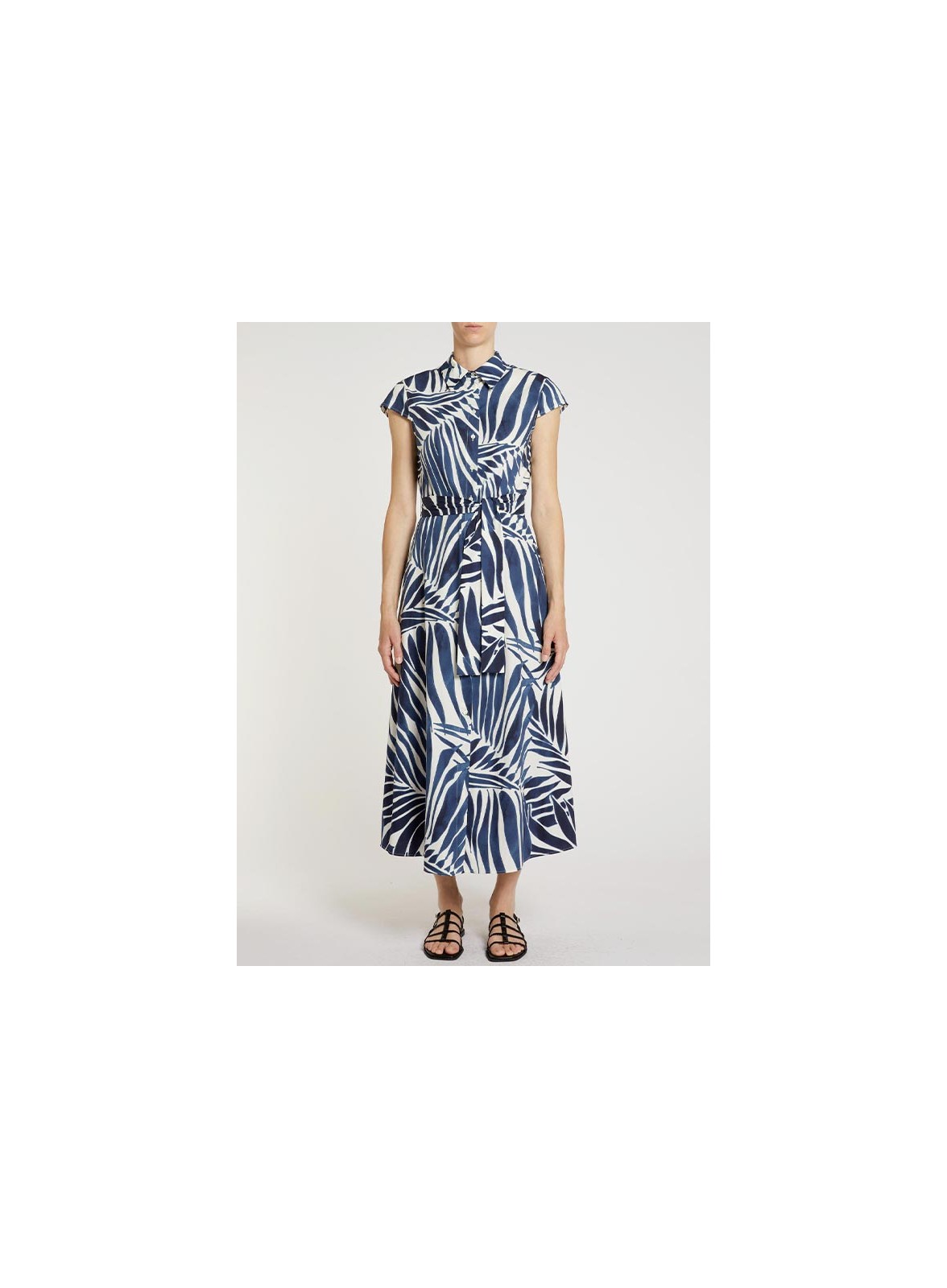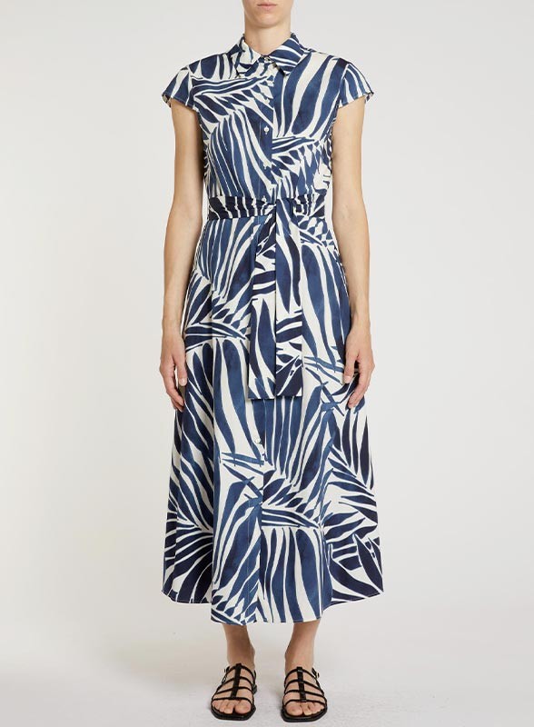Abito chemisier firmato PENNYBLACK in popeline con stampa a foglie di palma, leggero e femminile, perfetto per un look fresco ed elegante.