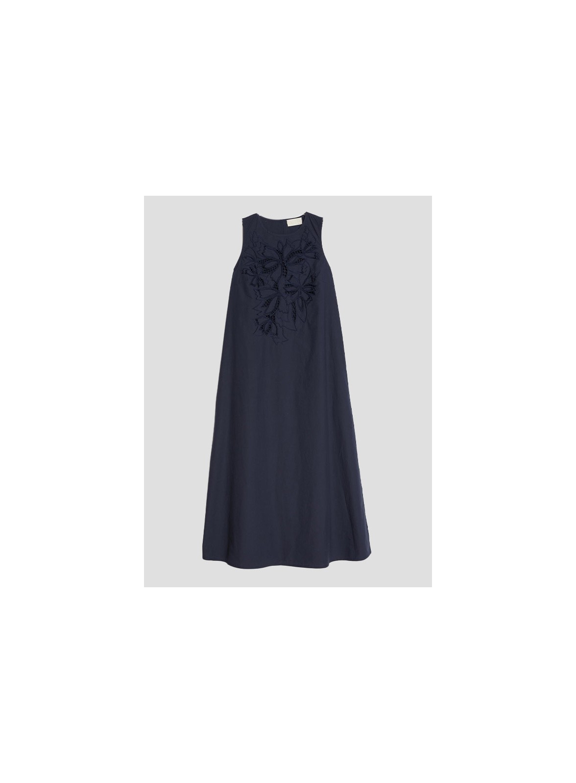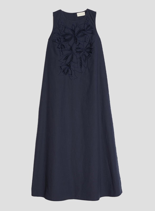 Abito lungo firmato IBLUES in popeline di cotone ricamato, leggero e raffinato, ideale per cerimonie all’aperto con fit ampio e femminile.