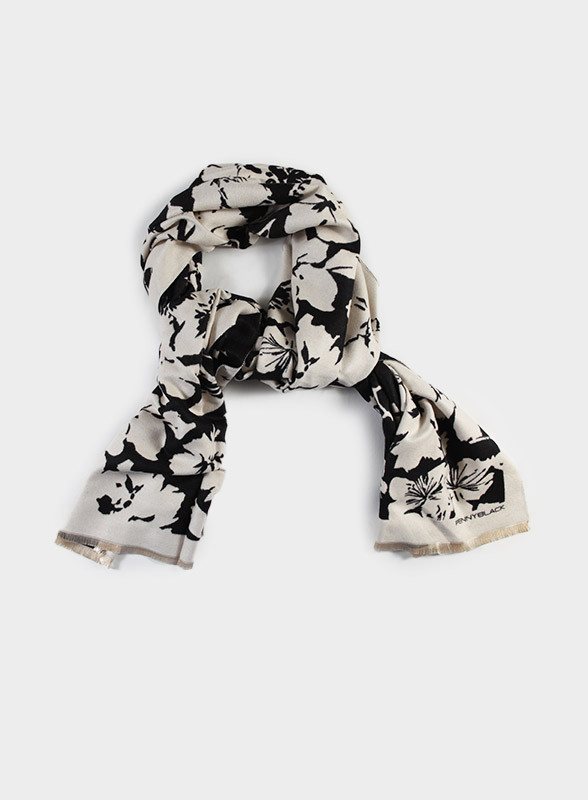 Stola in misto viscosa jacquard personalizzata con disegni di collezione. Disponibile anche nei colori: burro e viola; maculata nero e cammello; zebrata nero e cammello.