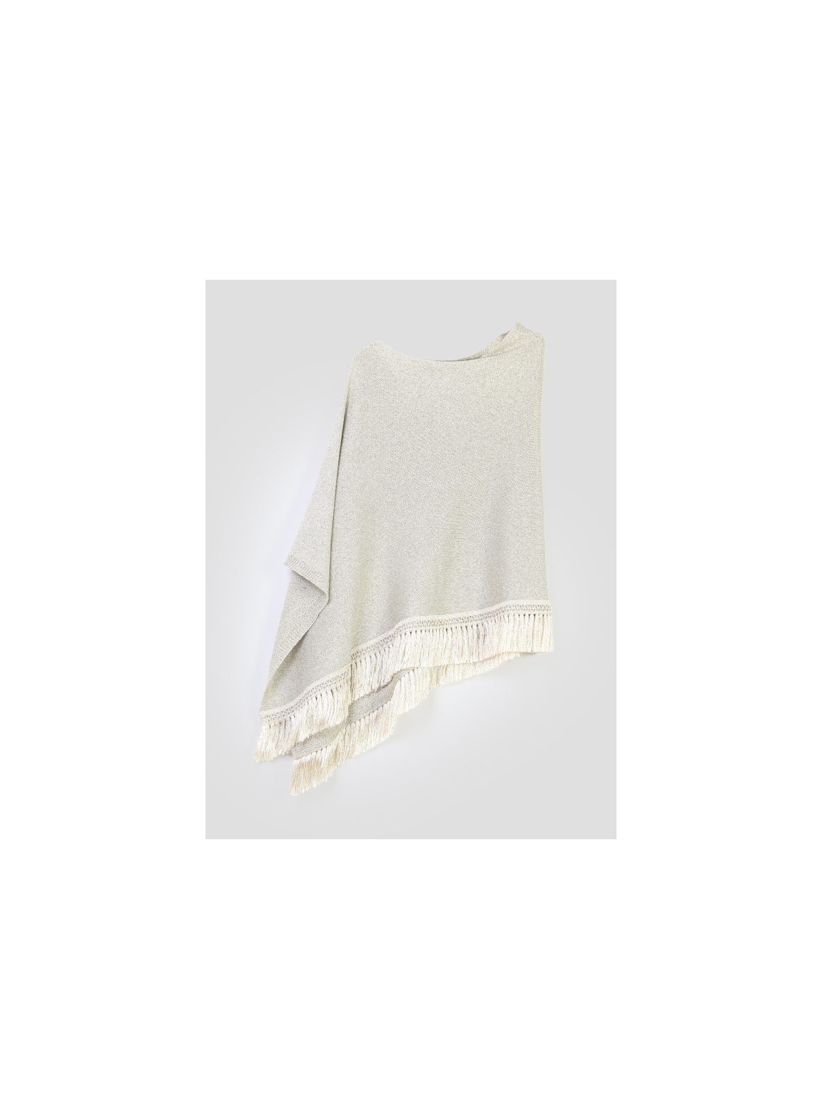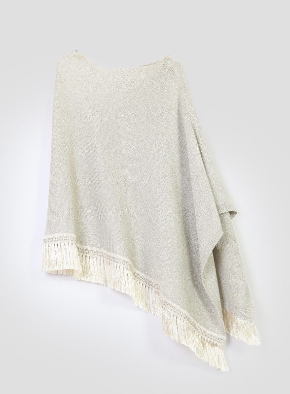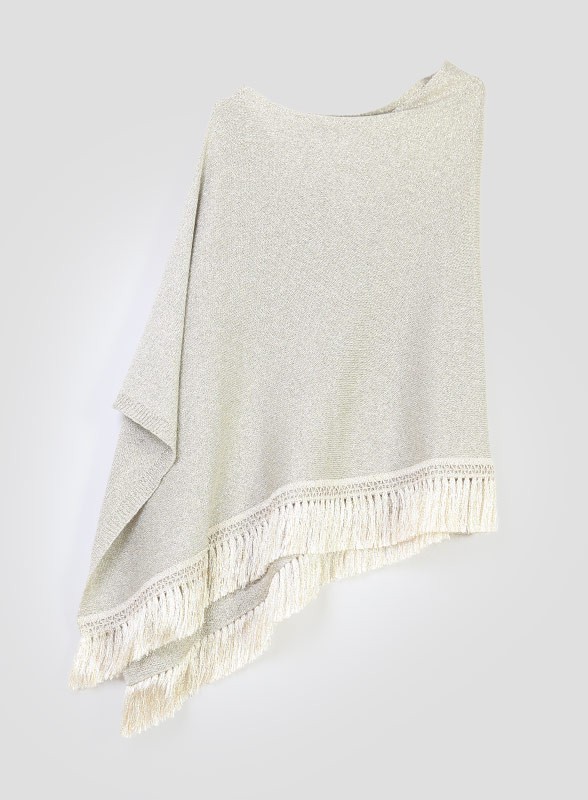 Poncho firmato OLIVIA in elegante filo lurex, con frange e taglio asimmetrico. Perfetto per look da cerimonia o occasioni speciali.