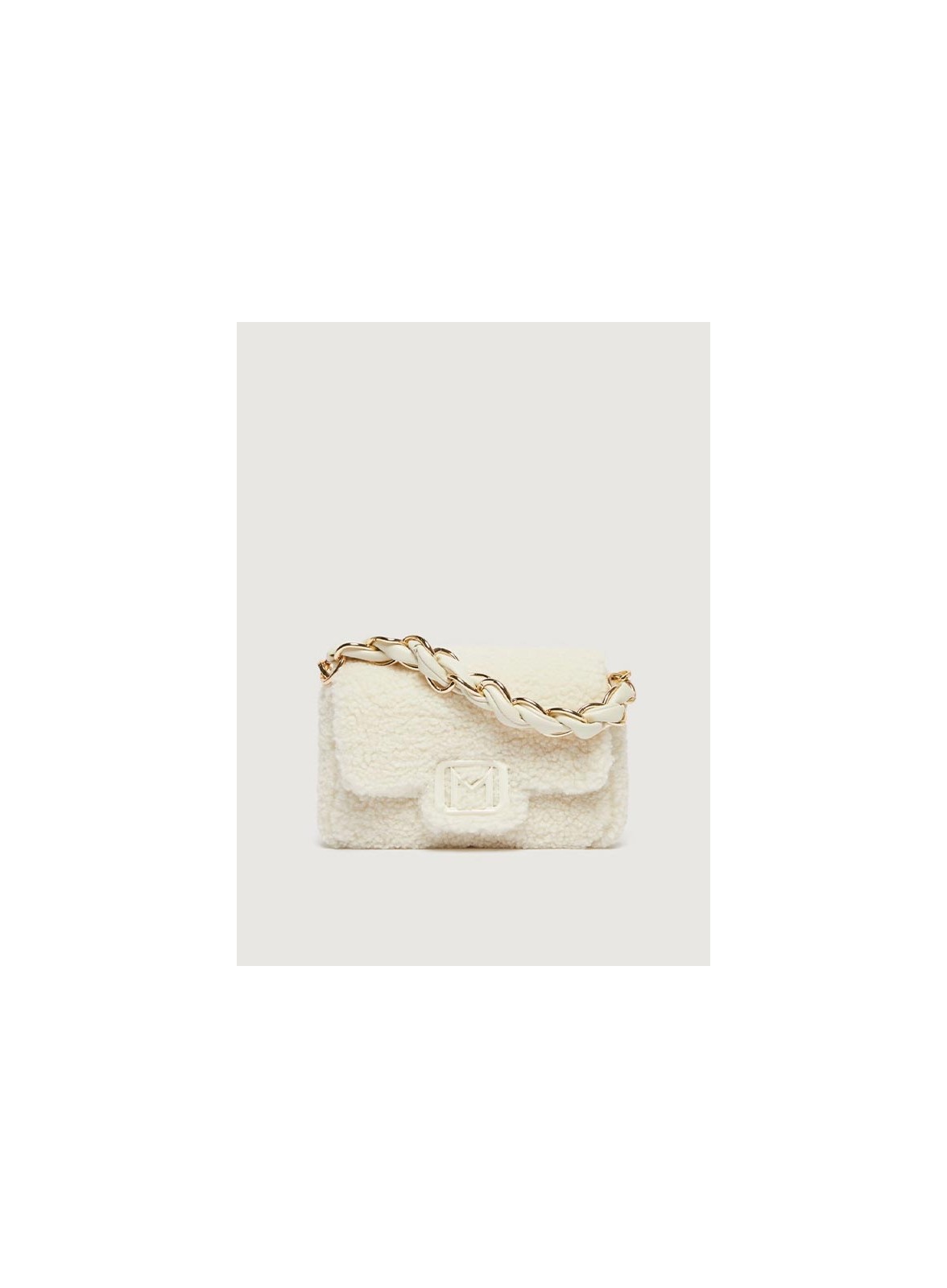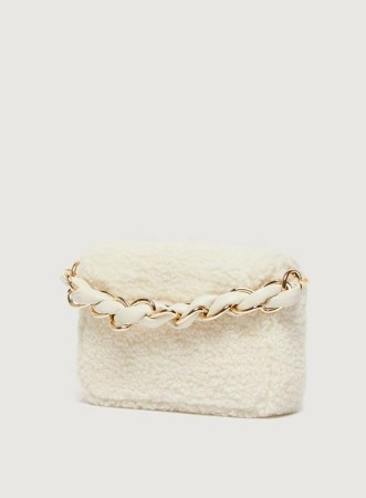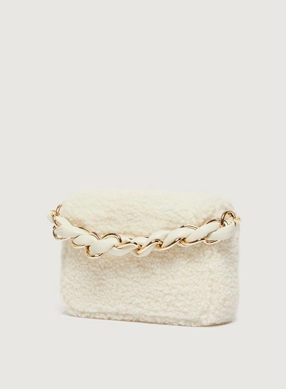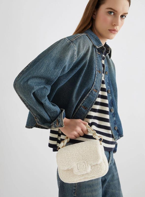 Borsa firmata MARELA, modello Le Muse piccola in tessuto furry, elegante e versatile, perfetta a mano o cross body.