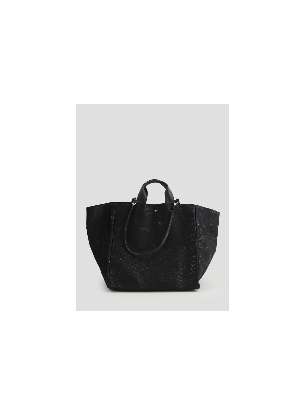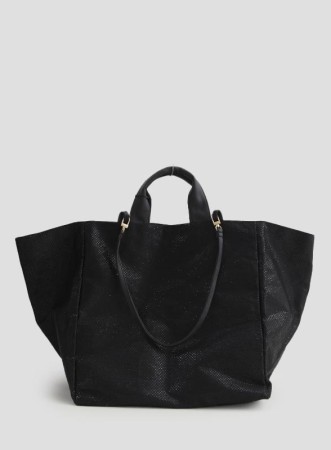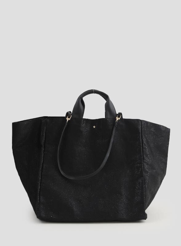 Borsa firmata L'AURA BAG in tessuto nero effetto glitter, con doppi manici e tracolla amovibile. Stile glamour e raffinato.