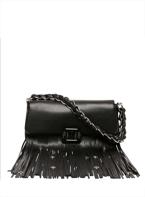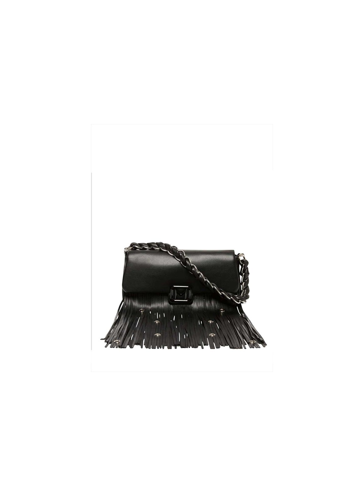 Borsa Le Muse firmata MARELLA in tessuto spalmato imbottito, con frange e occhielli, manico intrecciato con catena e tracolla rimovibile.