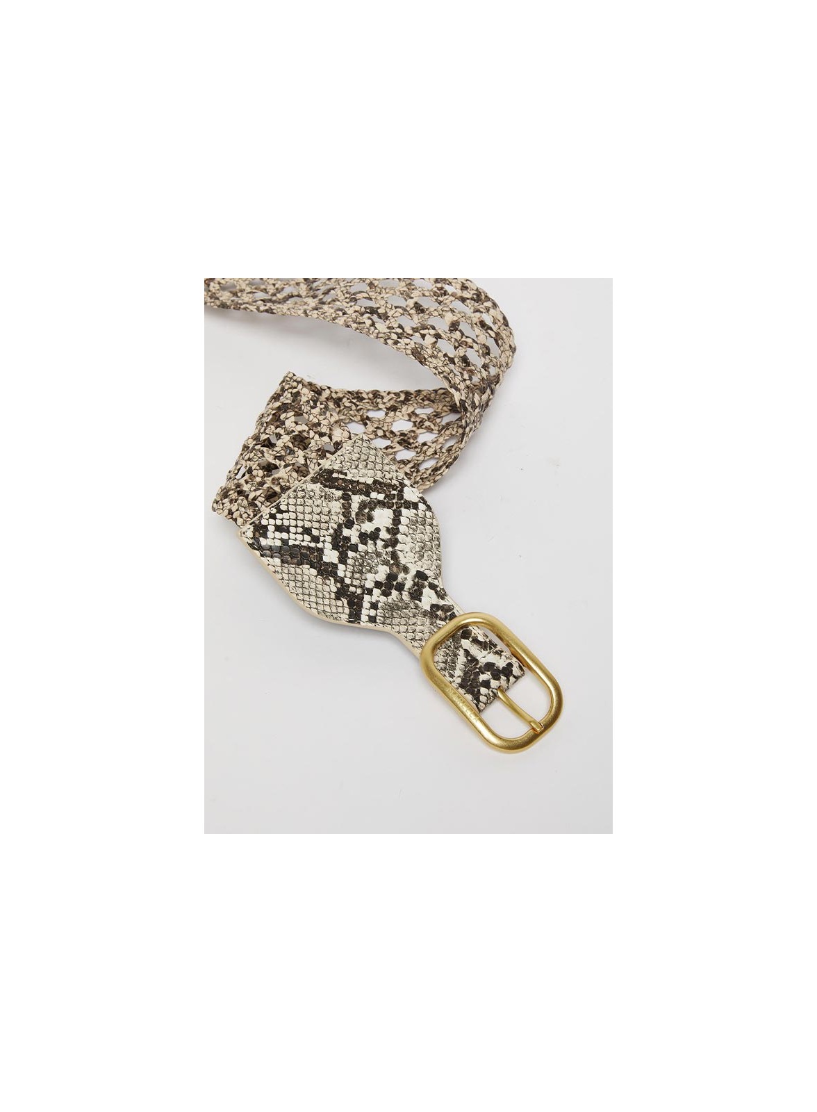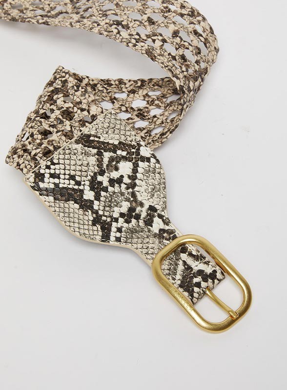 Cintura firmata MARELLA in stampa pitone marrone e beige, intrecciata con fibbia oro anticato, ideale per valorizzare il punto vita.