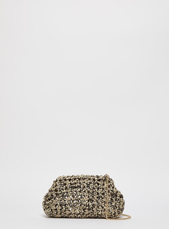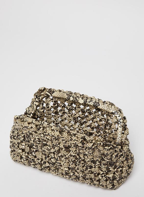 Borsa pochette firmata MARELLA dal design raffinato e contemporaneo, perfetta per completare look essenziali con un tocco distintivo. La lavorazione intrecciata unita alla stampa pitone dona carattere ed eleganza, rendendola ideale sia per occasioni casual chic che per eventi più ricercati. Il modello è sfoderato e presenta una chiusura con frame metallico interno ricoperto da magnete, garantendo praticità e sicurezza. La tracolla in catena metallica rimovibile permette di indossarla sia a mano che a spalla, adattandosi a ogni esigenza di stile.