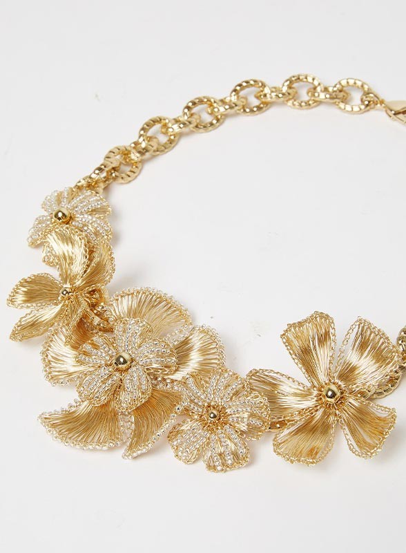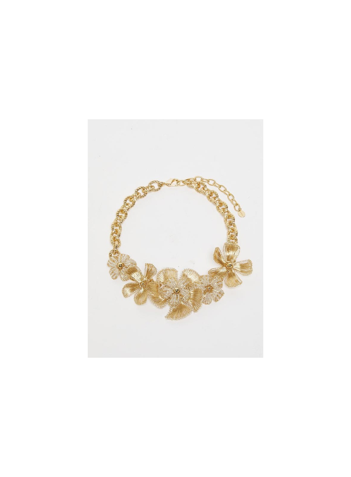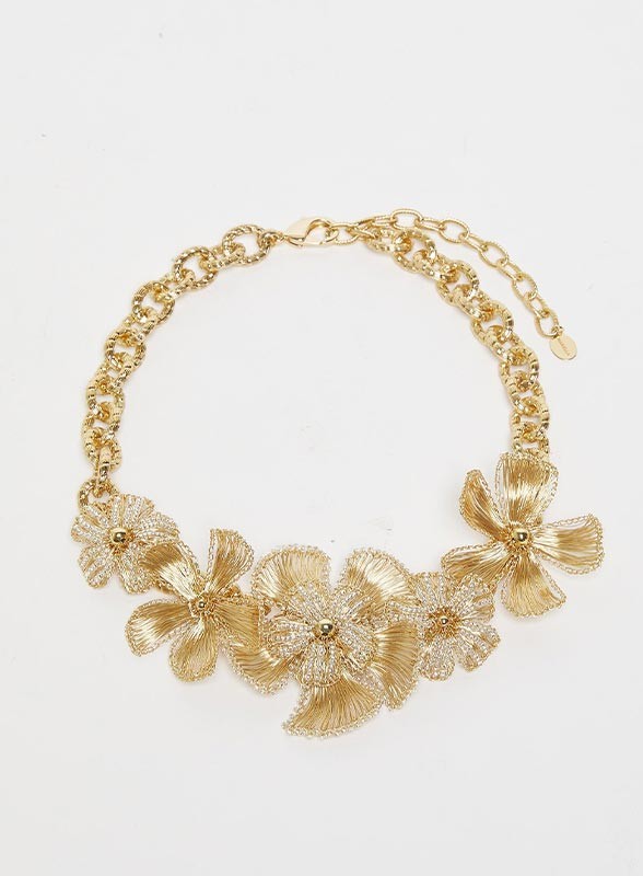 Collana girocollo firmata MARELLA in metallo dorato con fiori crochet, raffinata e luminosa, perfetta per valorizzare ogni outfit.