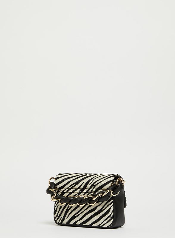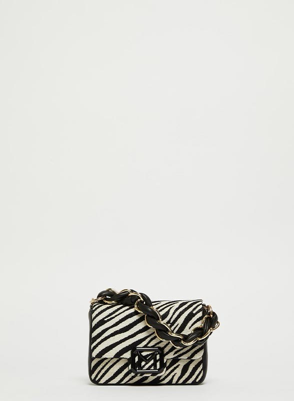 Borsa zebrata firmata Marella, elegante e versatile, con design iconico Le Muse e dettagli raffinati per ogni occasione.
