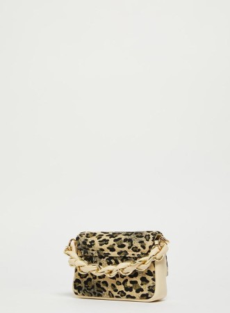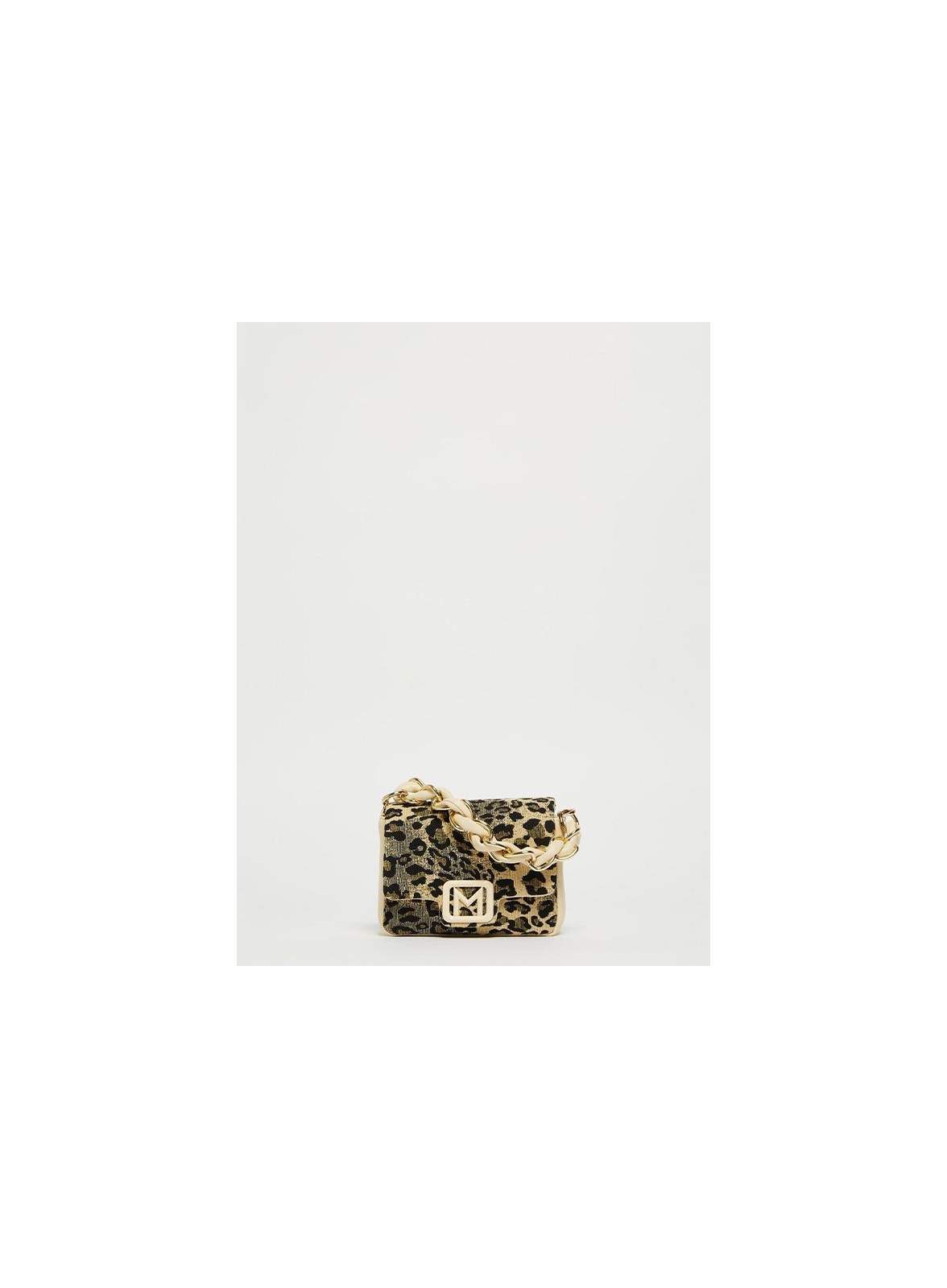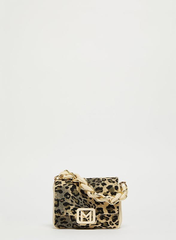 Borsa firmata Marella Le Muse in jacquard maculato, elegante e versatile, con catena intrecciata e tracolla removibile.