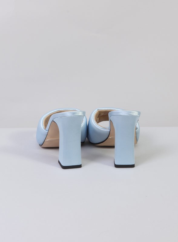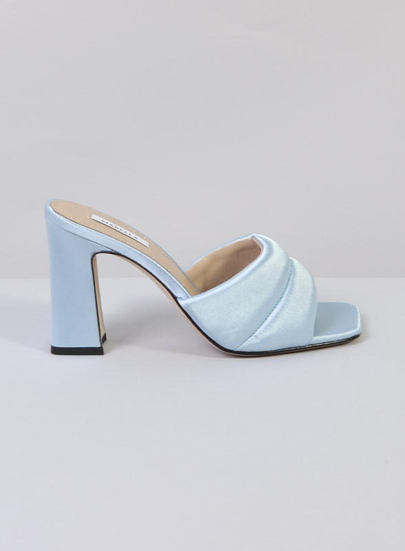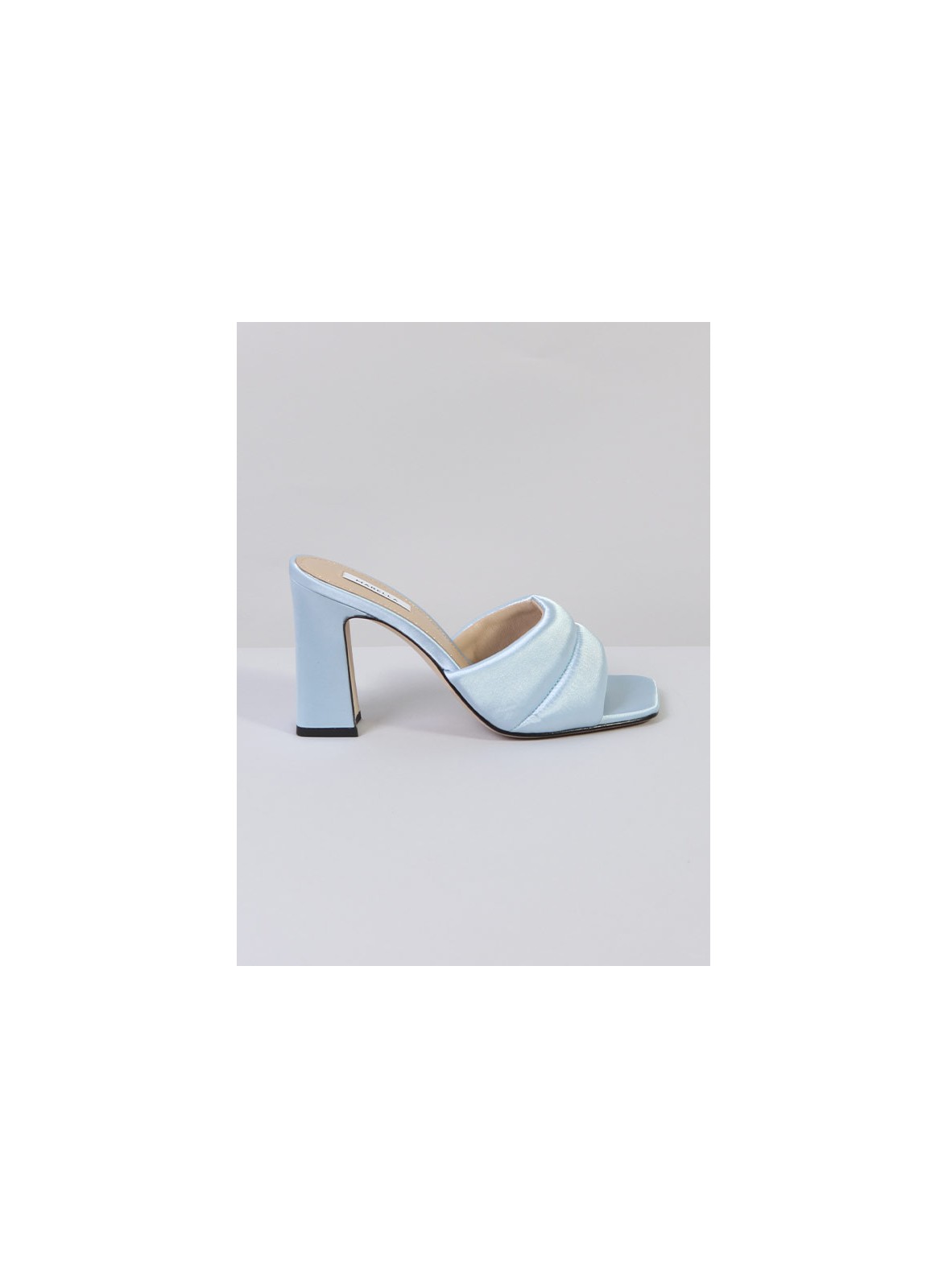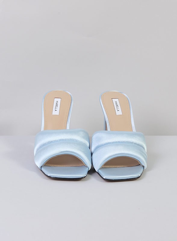 Sandalo firmato MARELLA in raso imbottito, con tacco largo ricoperto. Stile fresco e luminoso, ideale per l'estate.