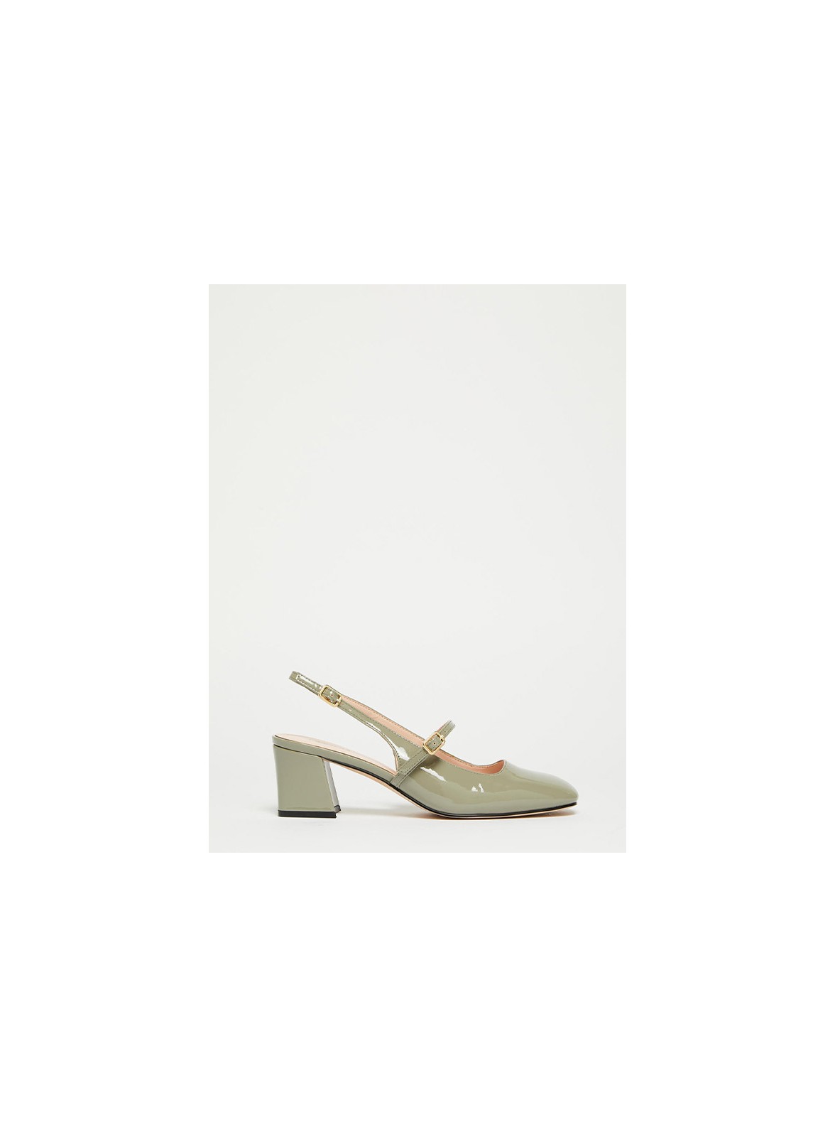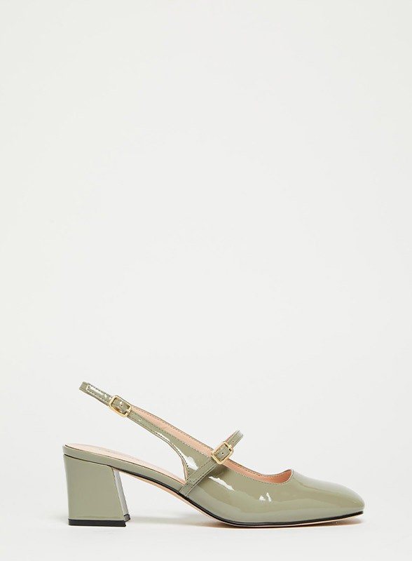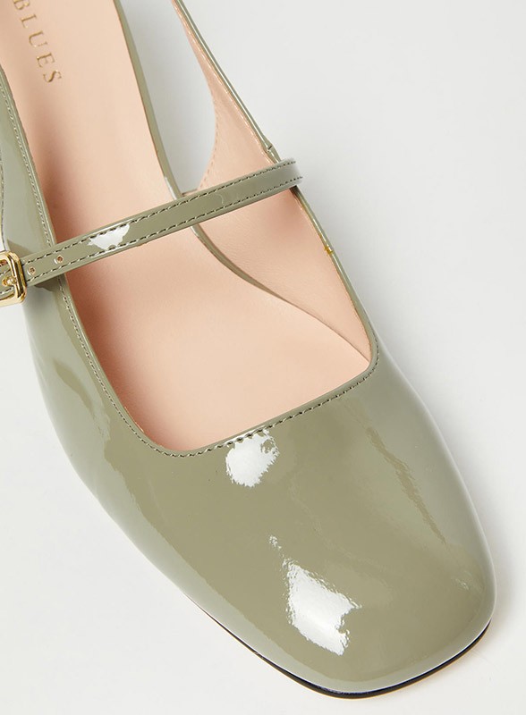 Scarpa Mary Jane firmata IBLUES in vernice verde salvia, dal fascino rétro glam con tacco squadrato e doppio cinturino regolabile.