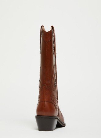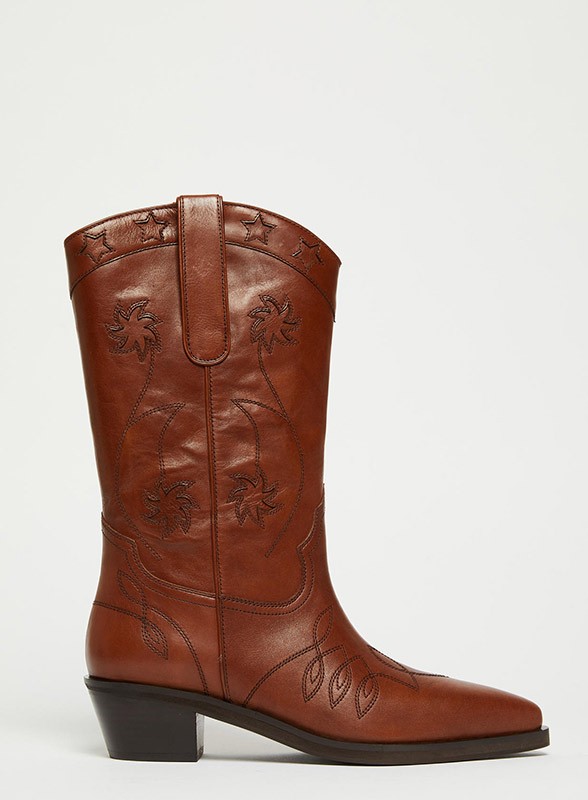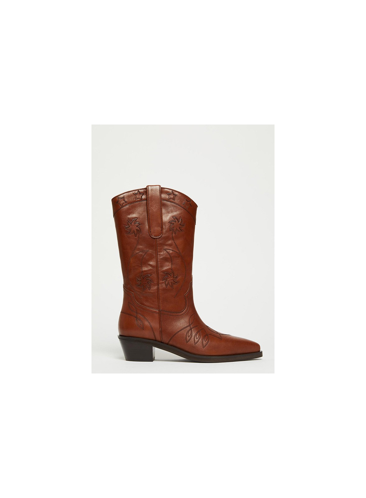 Stivale in pelle firmato IBLUES dallo stile Texas, con ricami e tacco 5 cm. Versatile e raffinato, perfetto con jeans o abiti leggeri.