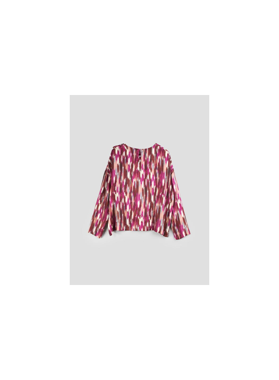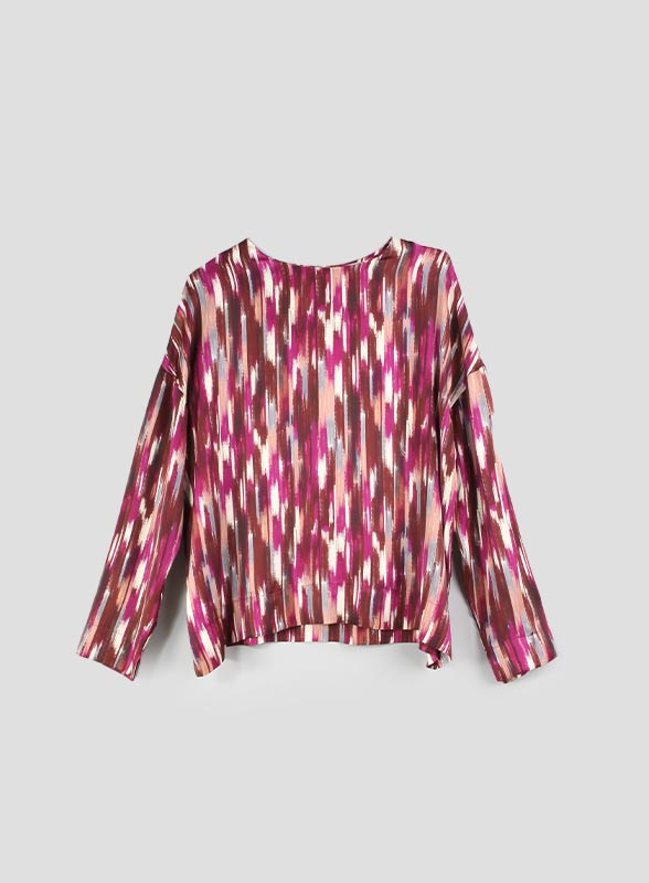 Maglia in pura viscosa stampata con chiusura a goccia. Viscosa ecologica. Questo tessuto è composto per il 51% da fibre di viscosa ecologica, ricavate da legno e polpa sostenibili, e provenienti da da fonti certificate e controllate. Scegliendo questo capo contribuite a creare un mondo migliore. Le collezioni donna firmate ottod'Ame sono caratterizzate da uno stile fresco e contemporaneo.