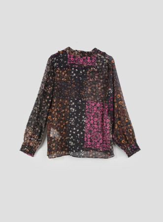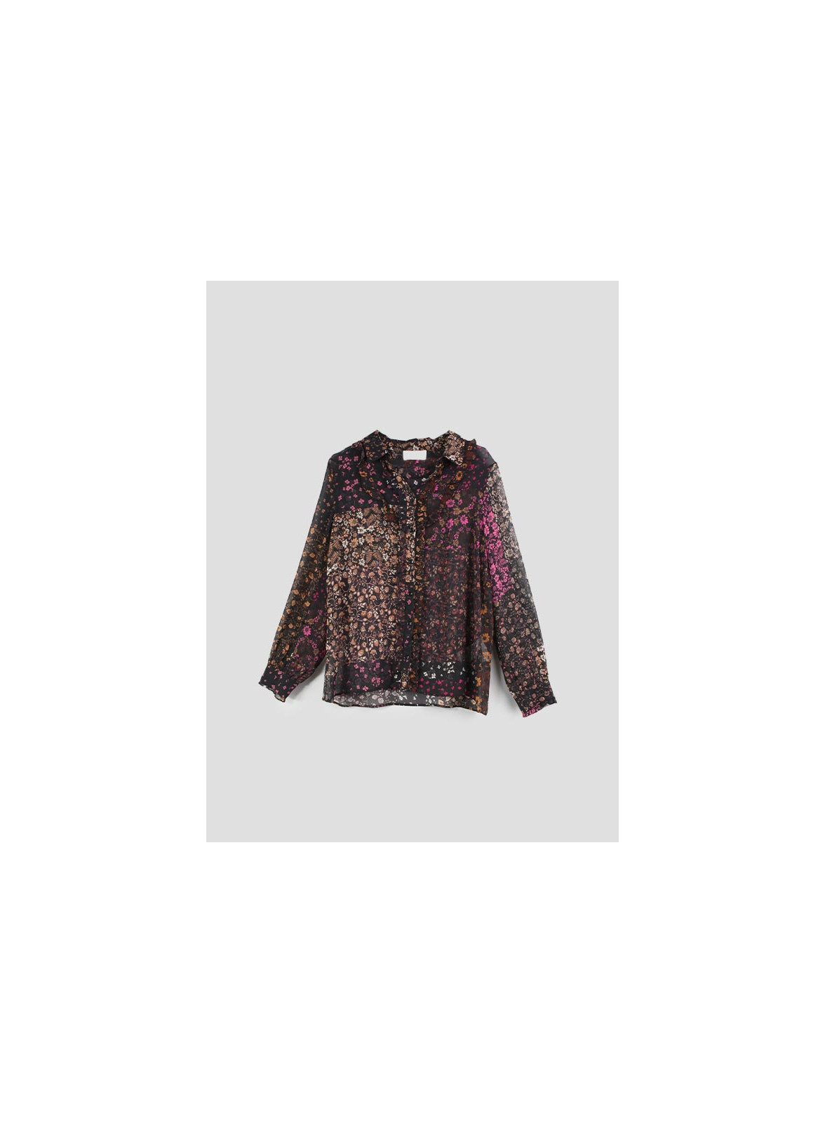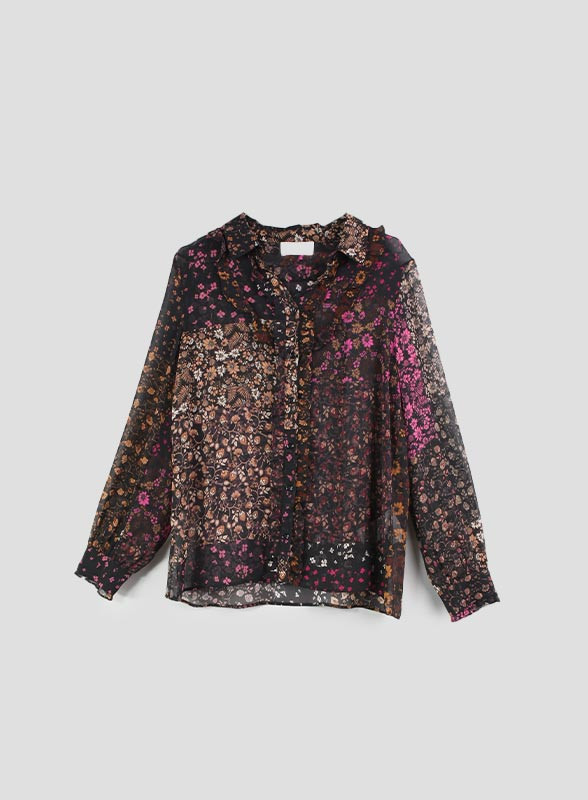 Camicia in crêpe stampato trasparente dalla linea dritta, chiusa con bottoni. Colletto e maniche lunghe con polsini. Decorata con ruches. Tessuto contenente poliestere rigenerato o poliammide rigenerato, fibre provenienti dal riciclo di materiale plastico. Lo stile I BLUES è ideale per donne audaci, curiose e desiderose di una vita piena e divertente. Le sue collezioni sono studiate nei minimi dettagli con il desiderio di donare carattere ad ogni look. Made in Italy.