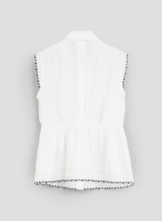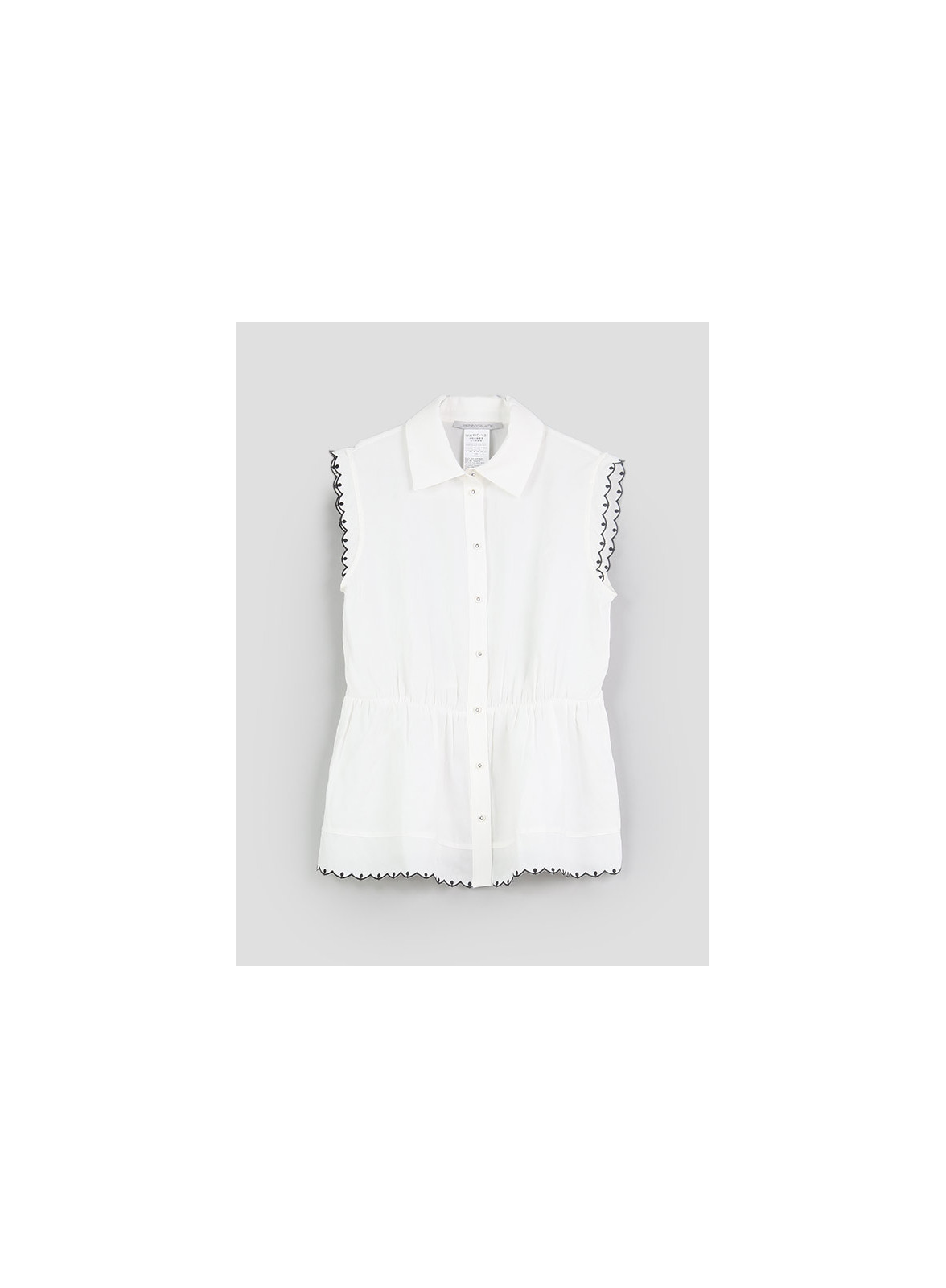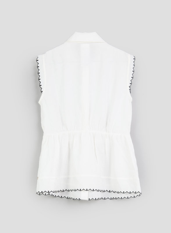I bordi smerlati e ricamati a contrasto aggiungono un tocco di eleganza unica. Il colletto e l'abbottonatura a camicia donano un look classico, mentre il taglio che sfiora la silhouette e la delicata arricciatura in vita definiscono una vestibilità femminile e sofisticata. Perfetto in total white per un look pulito e luminoso, o abbinato al blu per un mix & match estivo che non passa inosservato. Un capo versatile, ideale per chi cerca stile e comfort in ogni occasione.