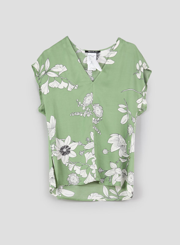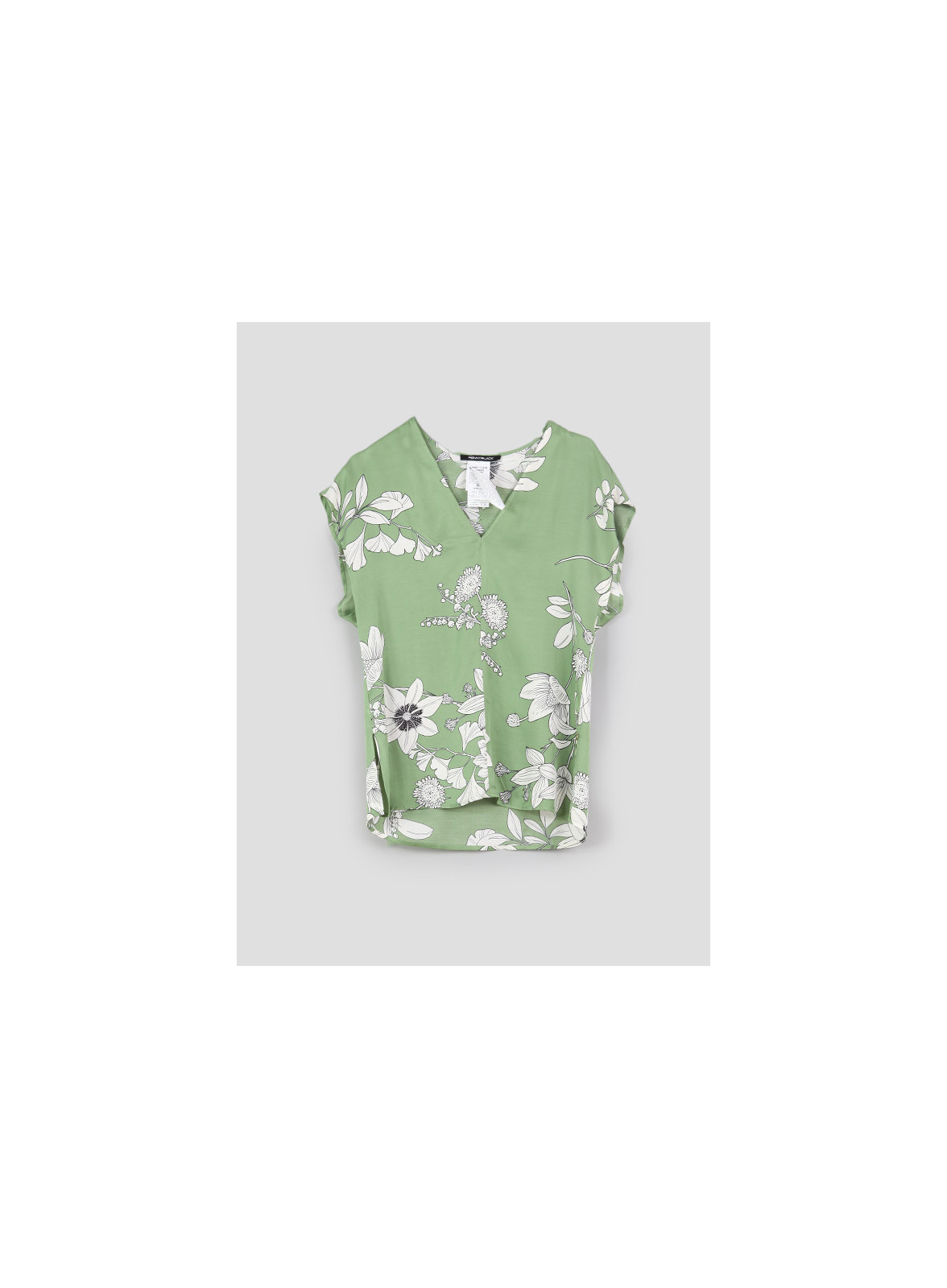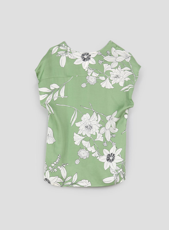 Caratterizzata da una vivace fantasia grafica a fiori tropicali, questa blusa incarna l'eleganza easy chic. Lo scollo a V e le maniche corte a kimono conferiscono un'aria raffinata e contemporanea. Il taglio diritto e morbido, arricchito da spacchetti laterali, garantisce comfort e libertà di movimento. Perfetta per completare un suit sartoriale per un look impeccabile in ufficio o abbinata a pantaloni informali per un outfit rilassato e di tendenza.