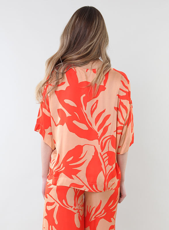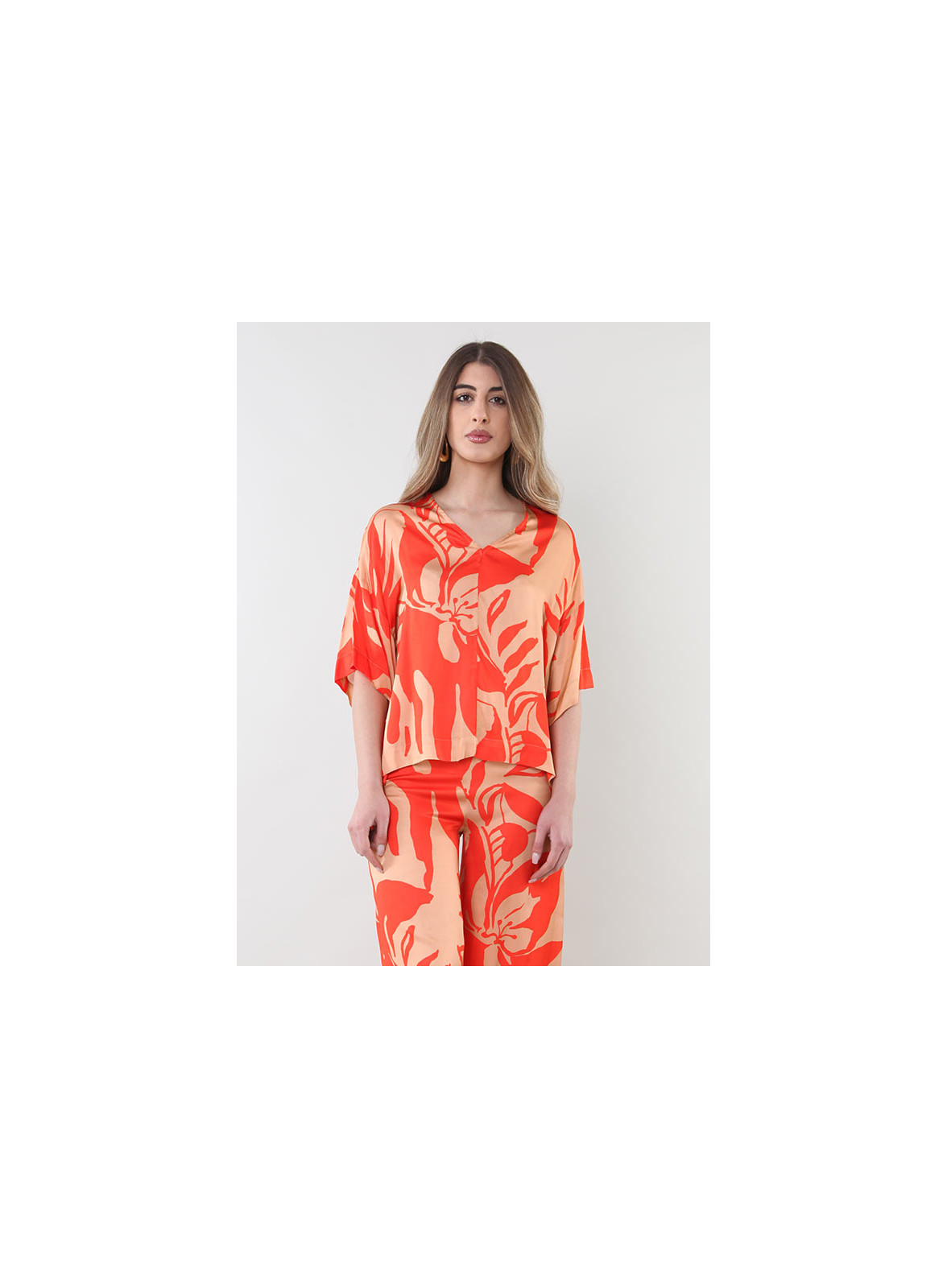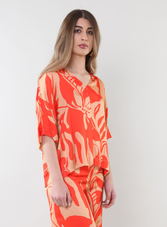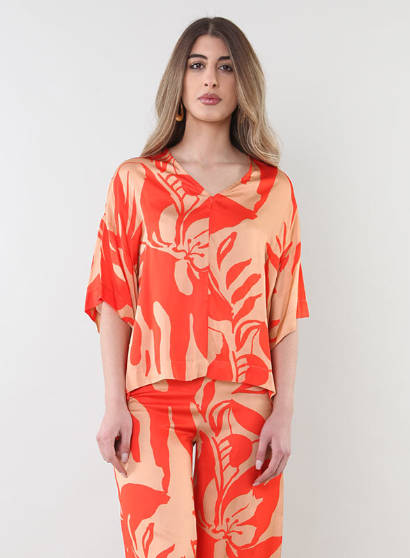 Realizzata in morbida viscosa con una fantasiosa stampa, presenta uno scollo a V che valorizza il décolleté e maniche a tre quarti con fondo arrotondato, perfette per qualsiasi occasione. La sua vestibilità comoda la rende un capo versatile che si adatta bene a diversi tipi di outfit, dal casual al più raffinato.