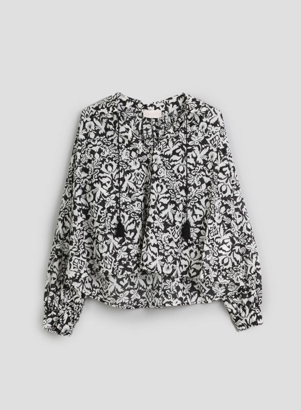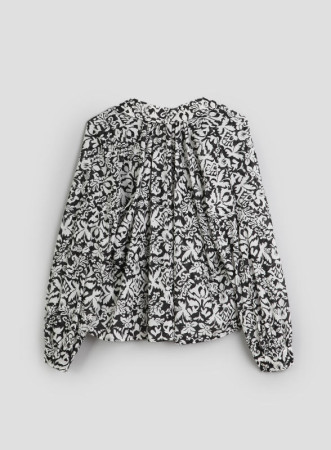 Realizzata in morbida mussola di cotone, presenta una linea svasata che accentua la femminilità. Il colletto e lo scollo a V con cordoncini aggiungono un tocco di raffinatezza, mentre le maniche lunghe con polsini offrono versatilità. Il retro arricciato aggiunge un tocco di originalità.