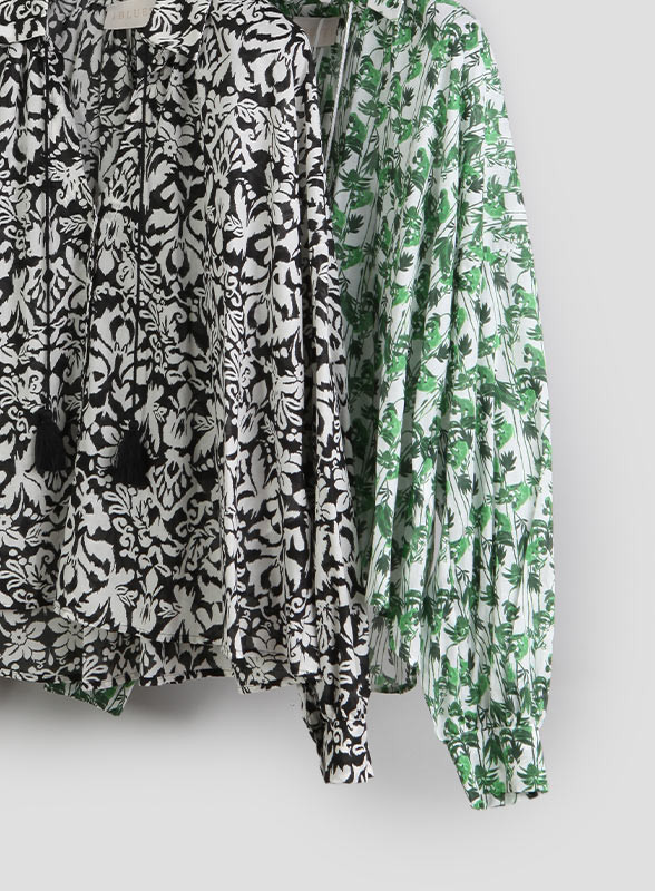 Camicia firmata Iblues in mussola di cotone stampato con linea svasata e dettagli raffinati della collezione SS24.