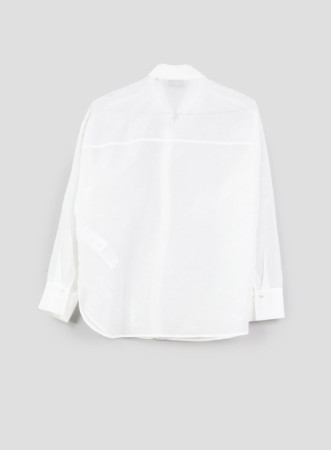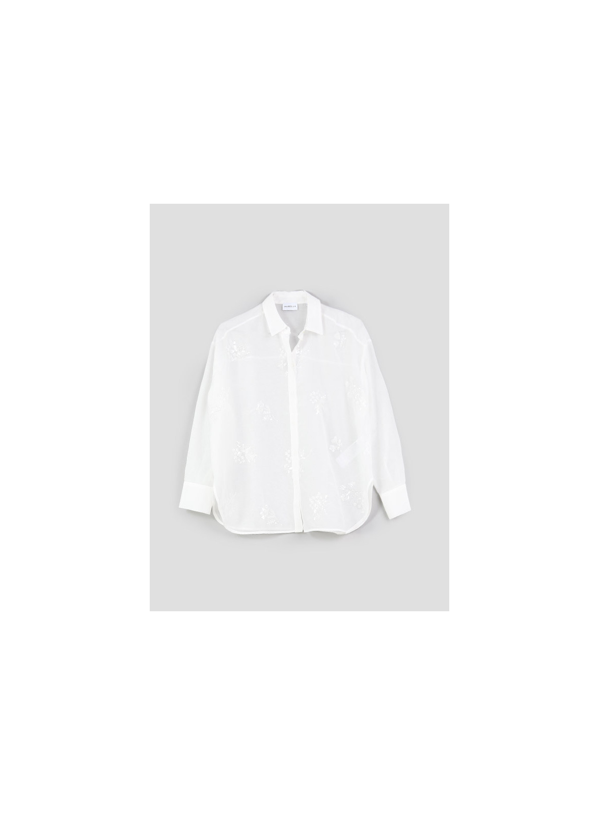 Camicia firmata Marella in mussola di cotone e seta, ricami e paillettes. Linea boxy, collo a camicia, maniche lunghe della collezione SS24.