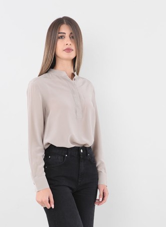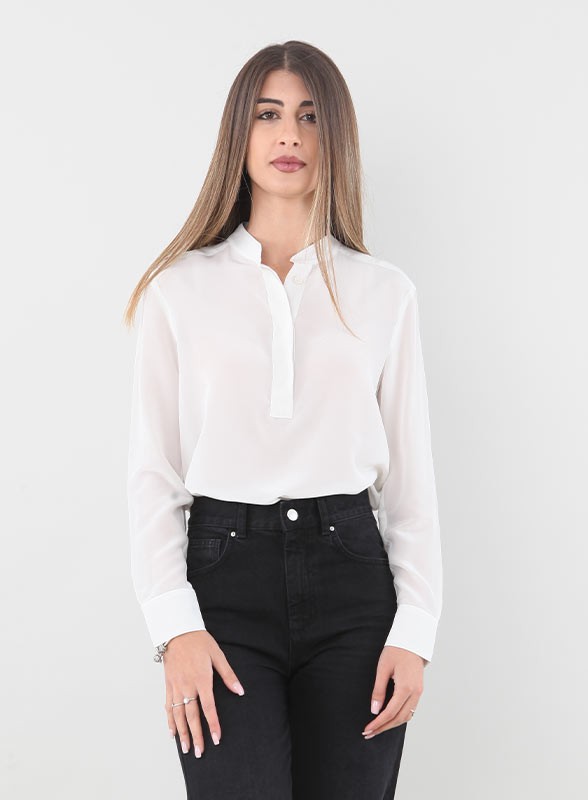 Camicia firmata Marella, linea dritta, collo alla coreana, maniche lunghe con polsino, fondo arrotondato. Scopri la nuova collezione.