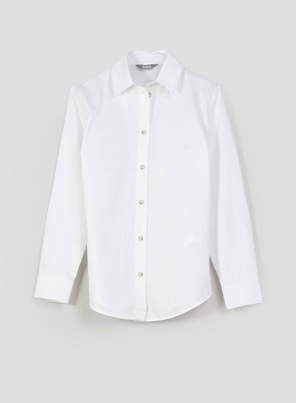 Camicia firmata MM BY MAXMARA, in morbido cotone, colletto classico e polsini alti. Scopri la nuova collezione.