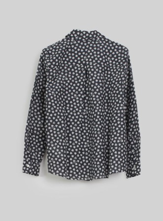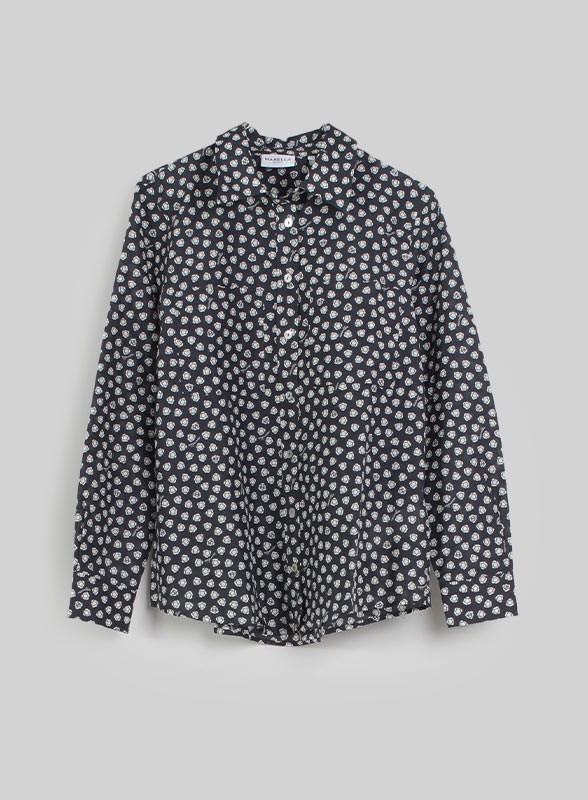 Camicia firmata Marella, realizzata in mussola di seta e cotone, unisce eleganza e comfort con la sua stampa dal glamour soft. La linea dritta e il collo a camicia offrono un look raffinato, mentre la chiusura con bottoni a vista e le tasche applicate sul petto, chiuse da patta e bottoni, aggiungono un tocco di originalità. Leggera e femminile, questa camicia è versatile: perfetta per l'ufficio abbinata a pantaloni sartoriali o per look più casual con jeans.