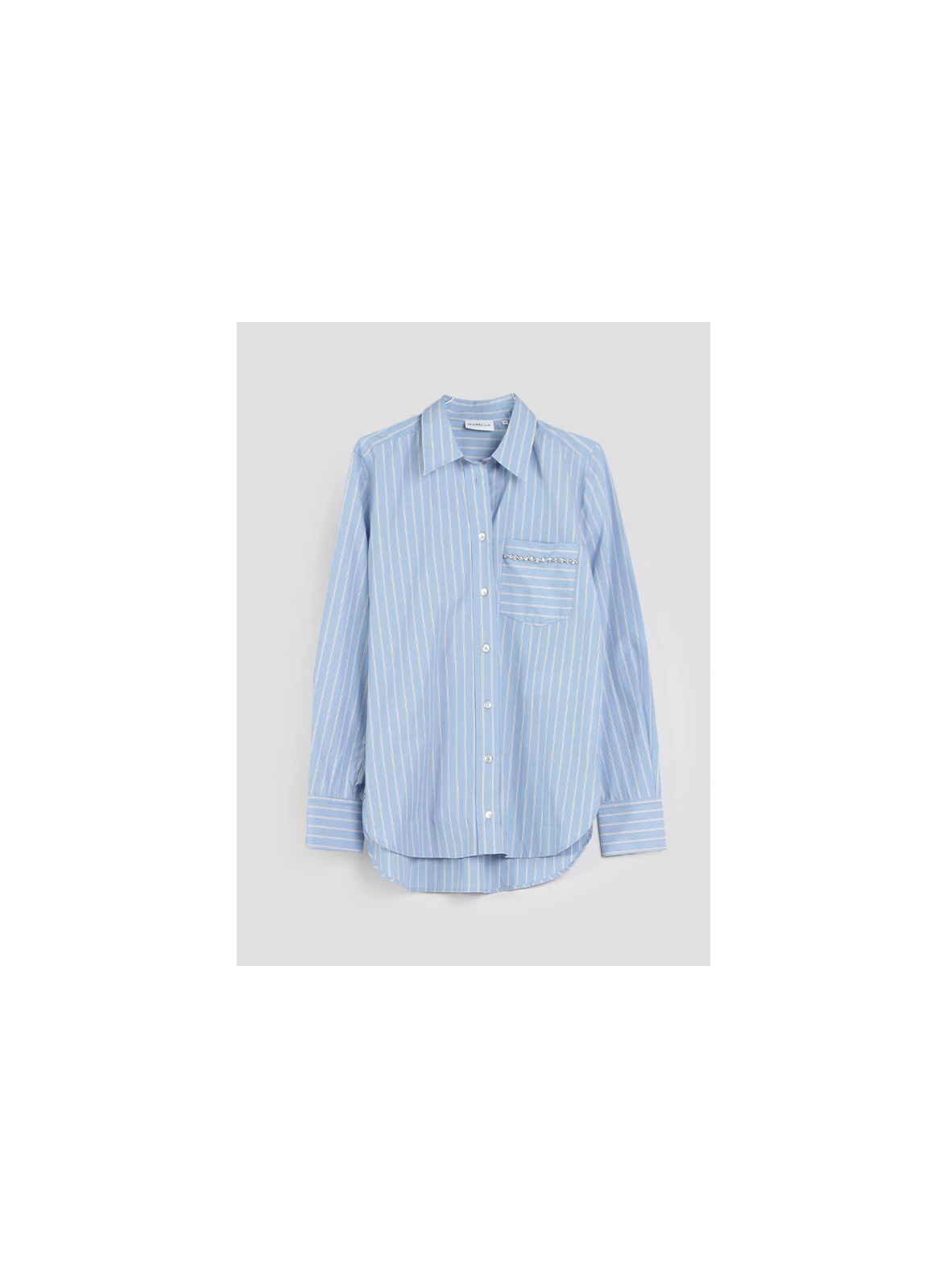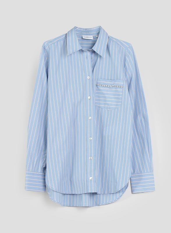 Camicia firmata Marella in popeline di puro cotone con fit scivolato, taschino con catena di strass e bottoni a vista. Perfetta per un tocco sofisticato.